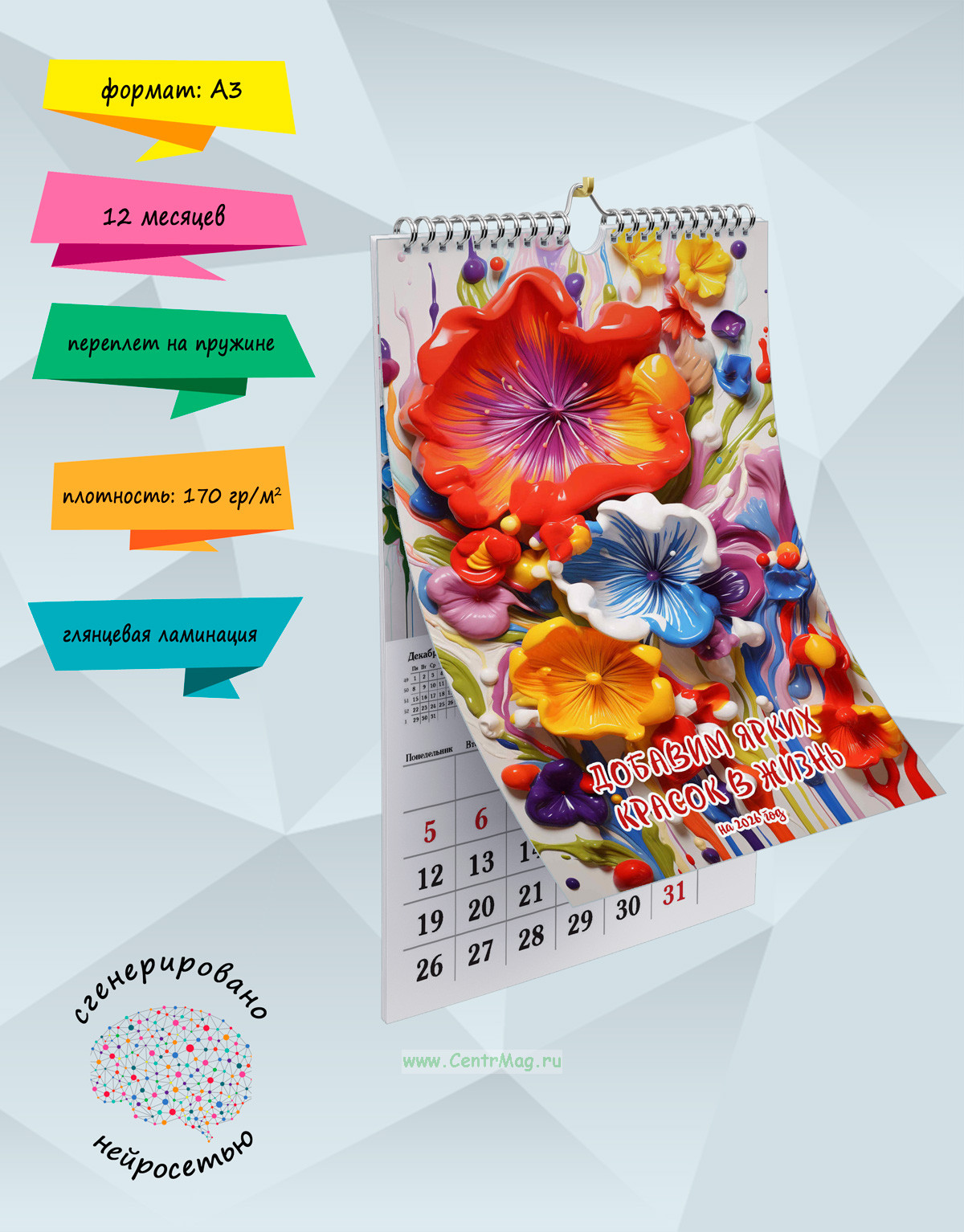 Календарь содержит красочные изображения цветов. Обложка нарисована с помощью искусственного интеллекта. Мы подготовили для вас прекрасных 12 иллюстраций.