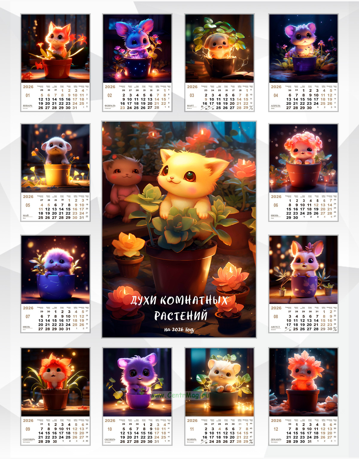 Календарь содержит изображения очаровательных фантазийных зверьков, похожих на маленьких пушистых существ, оформлен в тёплой, сказочной атмосфере, создавая уютное и волшебное настроение для каждого месяца года.
