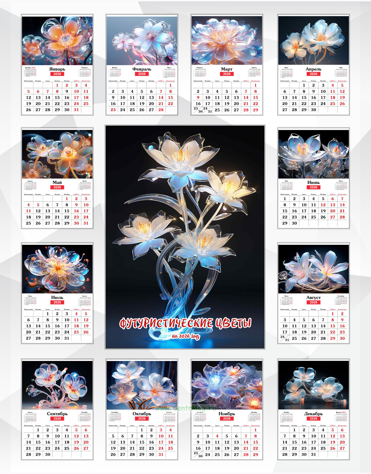 Календарь содержит очаровательные изображения футуристических цветов. Иллюстрации созданы с помощью искусственного интеллекта. Идеально подойдет в качестве подарка друзьям, родственникам или даже себе.