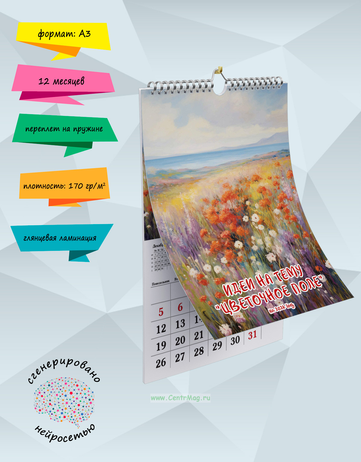 Календарь содержит завораживающие изображения полевых цветов. Иллюстрации созданы с помощью искусственного интеллекта. Идеально подойдет в качестве подарка друзьям, родственникам или даже себе.
