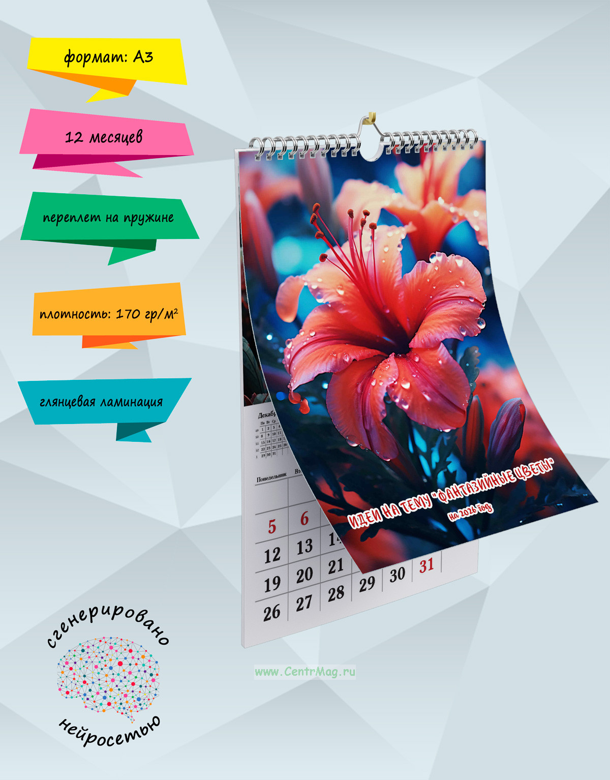 Календарь содержит очаровательные изображения цветов. Иллюстрации созданы с помощью искусственного интеллекта. Идеально подойдет в качестве подарка друзьям, родственникам или даже себе.