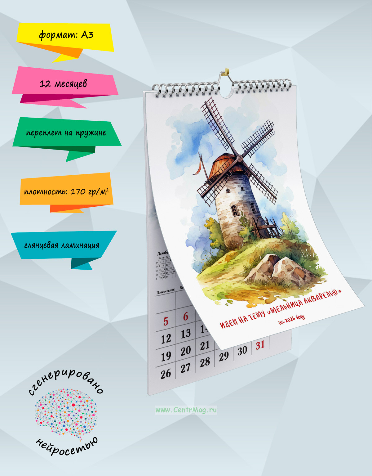 Календарь содержит завораживающие изображения пейзажей с ветряными мельницами. Иллюстрации созданы с помощью искусственного интеллекта. Идеально подойдет в качестве подарка друзьям, родственникам или даже себе.