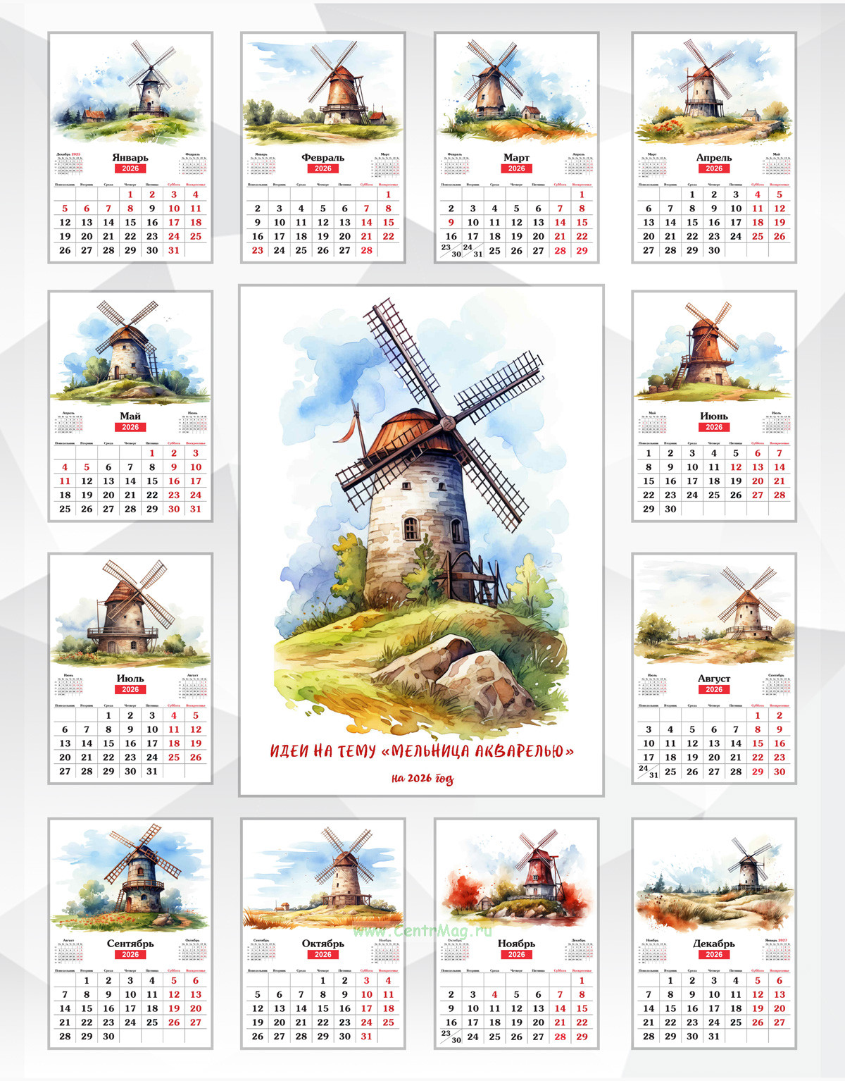 Календарь настенный, перекидной "Пейзажи с мельницами" на 2026 год (550 руб.)