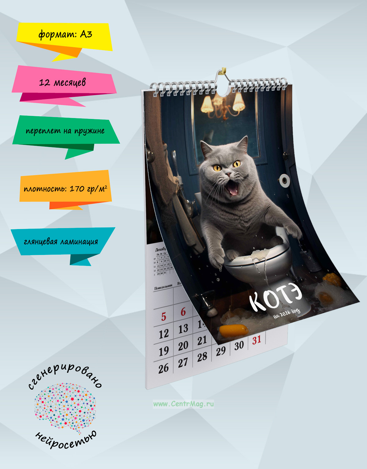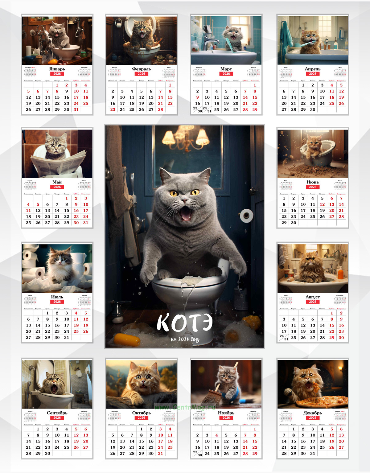Календарь содержит забавные картинки котиков-хулиганов и котиков, занимающихся человеческими делами.