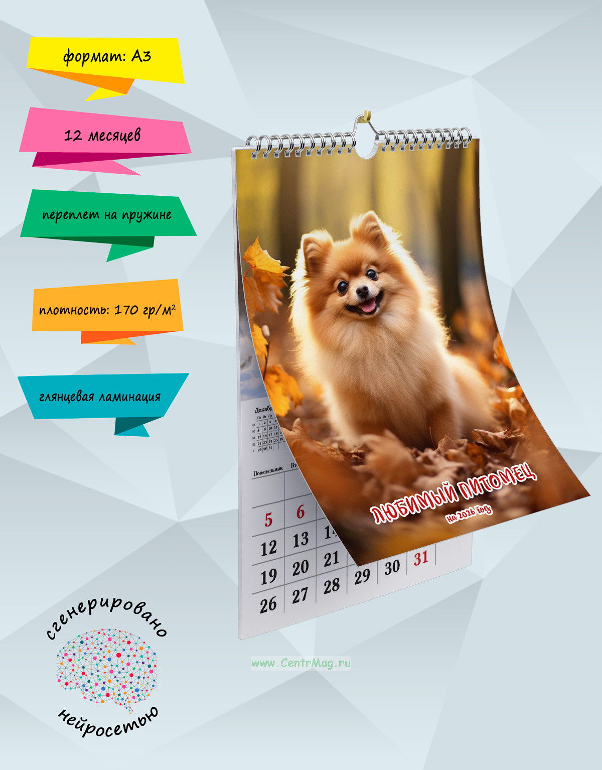 Календарь содержит очаровательные изображения со Шпицами. Иллюстрации созданы с помощью искусственного интеллекта. Идеально подойдет в качестве подарка друзьям, родственникам или даже себе.
