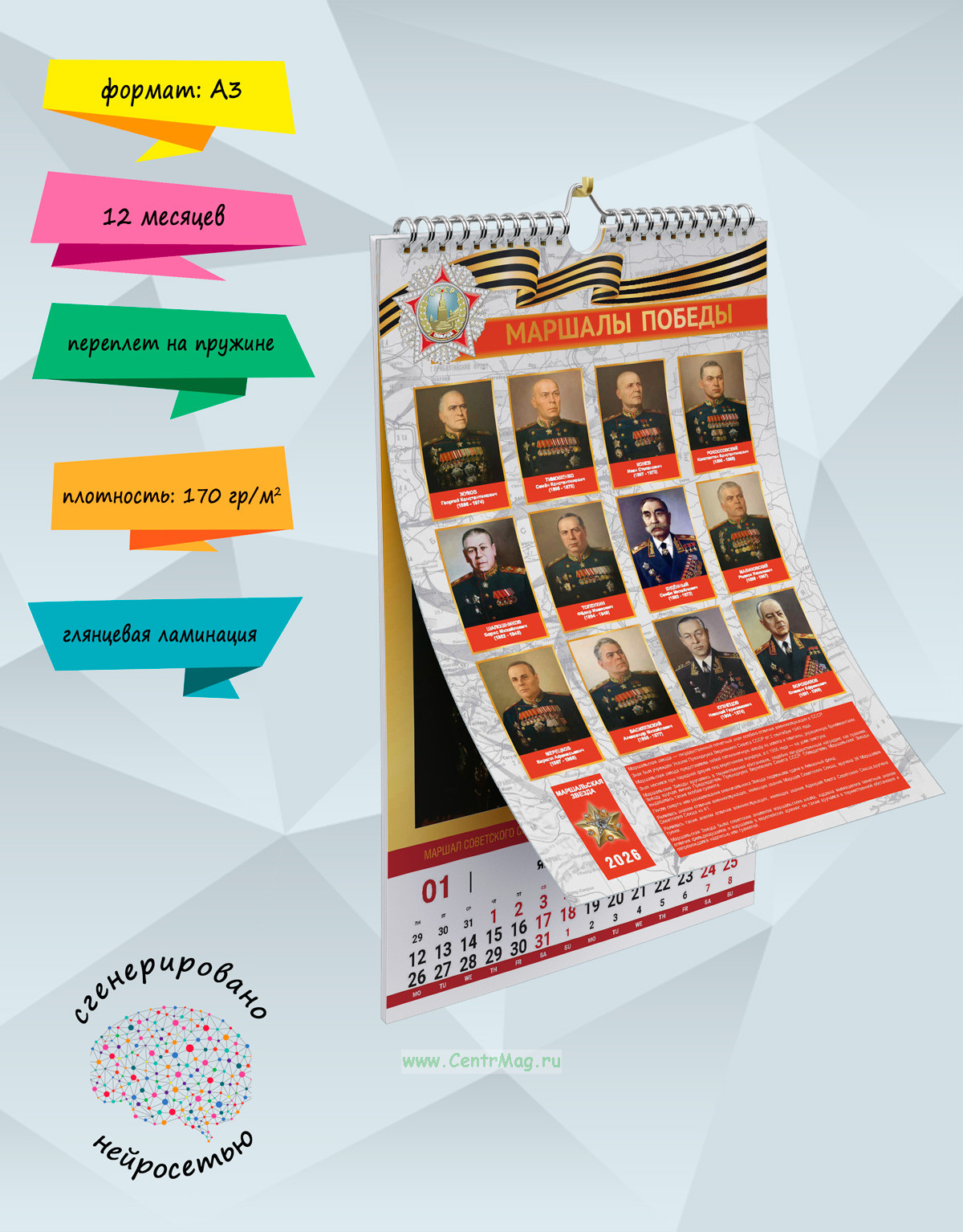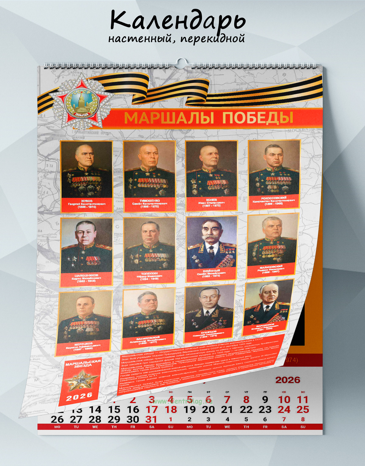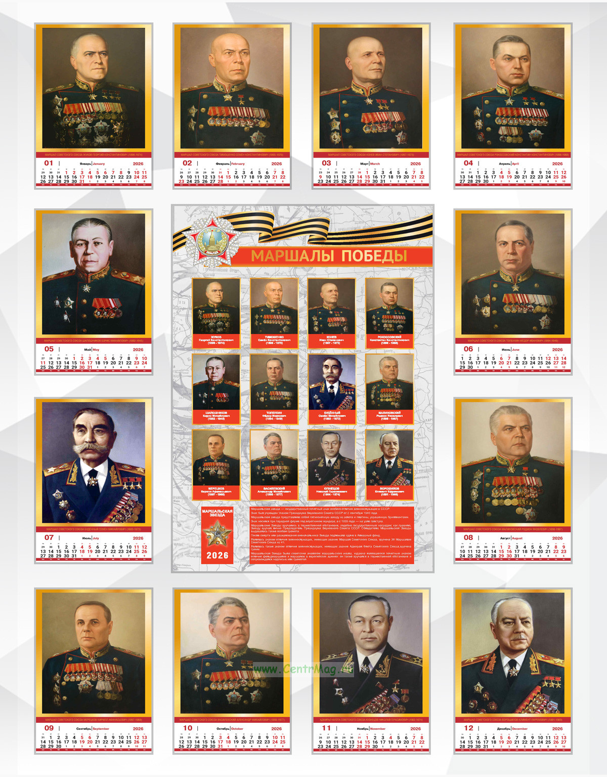 Календарь содержит 12 портретов Маршалов Победы, а также описание знака "Маршальская звезда":