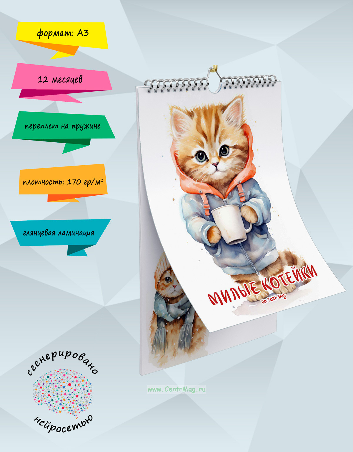 Календарь содержит очаровательные изображения с котиками. Иллюстрации созданы с помощью искусственного интеллекта. Идеально подойдет в качестве подарка друзьям, родственникам или даже себе.