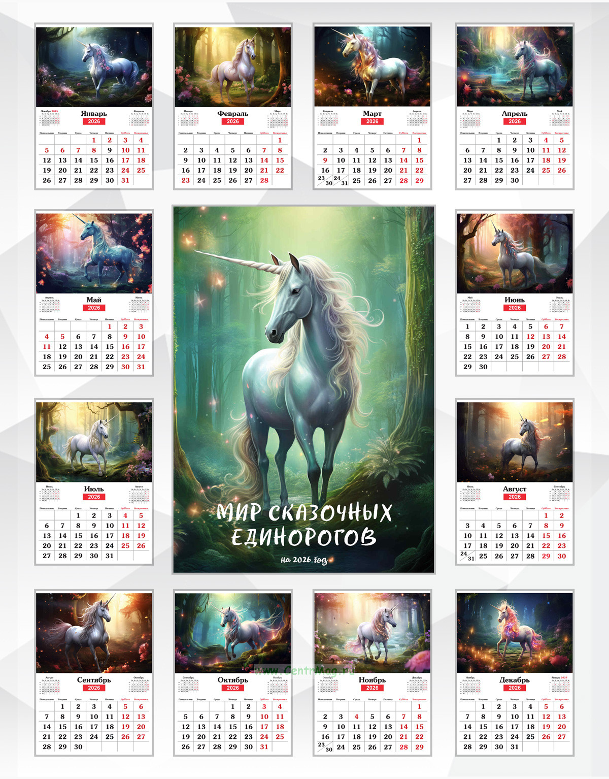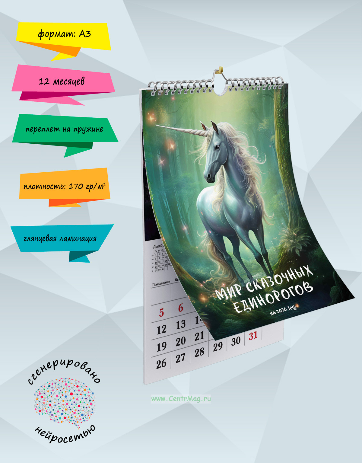 Календарь содержит изображения сказочных единорогов. Обложка нарисована с помощью искусственного интеллекта. Мы подготовили для вас прекрасных 12 иллюстраций.