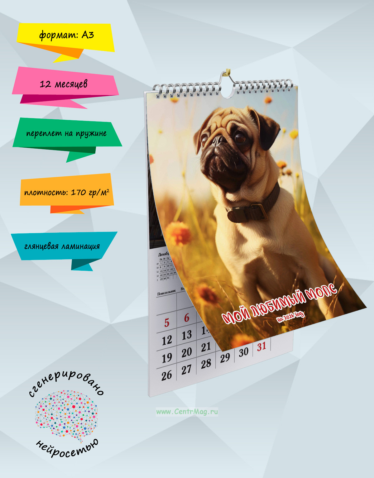 Календарь содержит изображения очаровательных мопсов. Обложка нарисована с помощью искусственного интеллекта. Мы подготовили для вас прекрасных 12 иллюстраций.