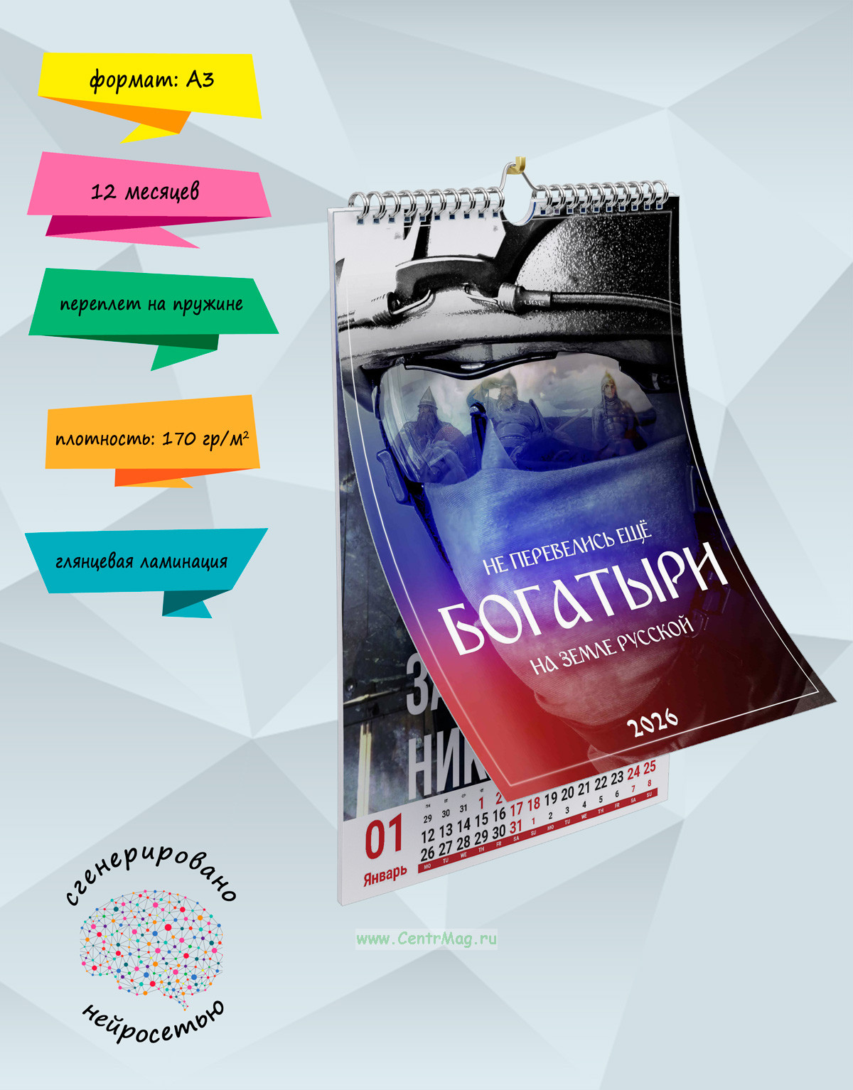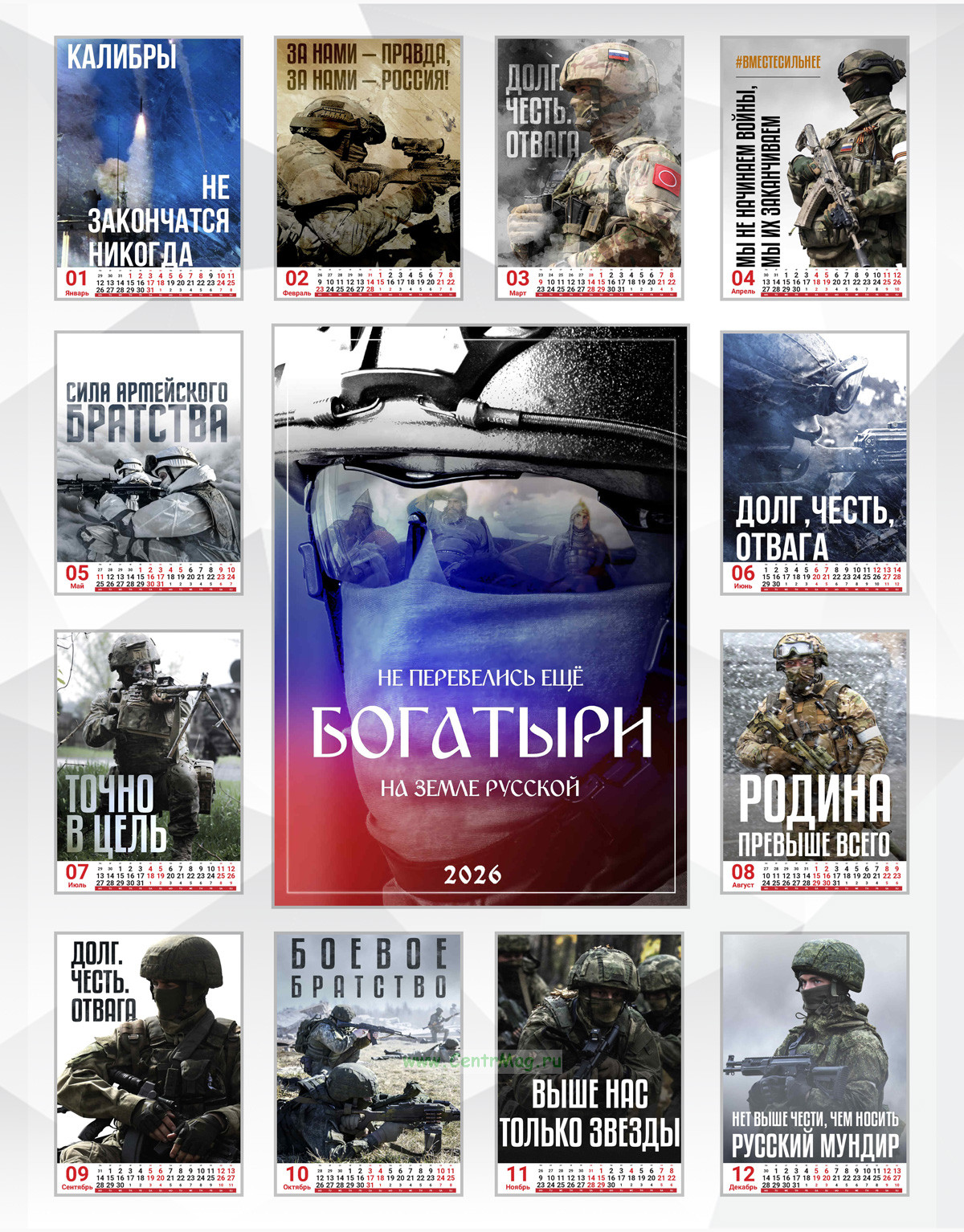 Календарь "Не перевелись еще богатыри на Земле Русской" содержит 12 изображений российских военных с надписями:
