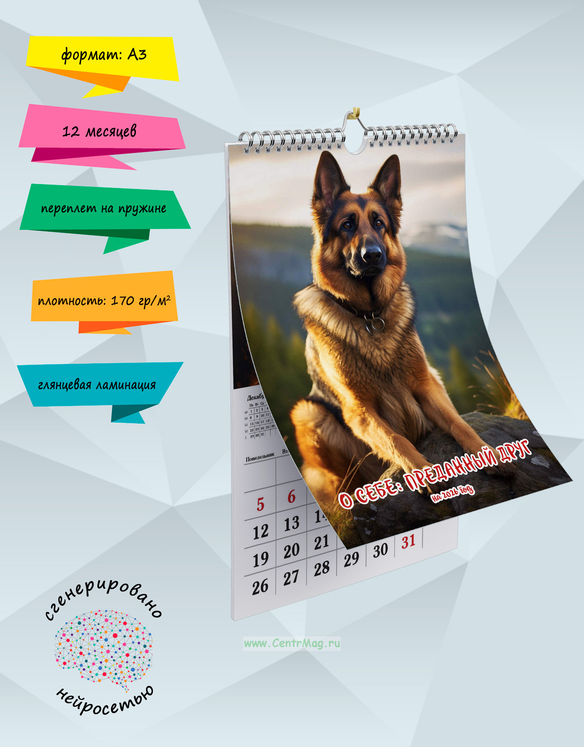 Календарь содержит очаровательные изображения овчарок. Иллюстрации созданы с помощью искусственного интеллекта. Идеально подойдет в качестве подарка друзьям, родственникам или даже себе.