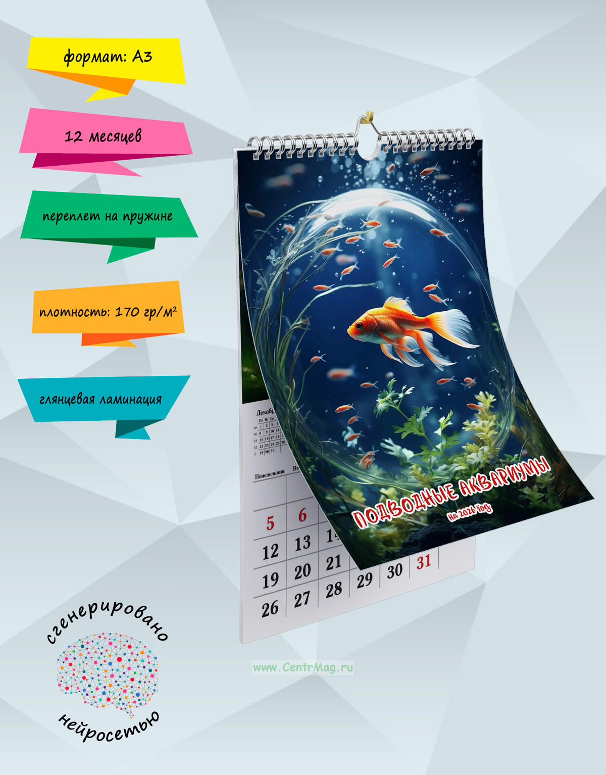 Календарь содержит очаровательные изображения рыбок в подводных аквариумах. Иллюстрации созданы с помощью искусственного интеллекта. Идеально подойдет в качестве подарка друзьям, родственникам или даже себе.