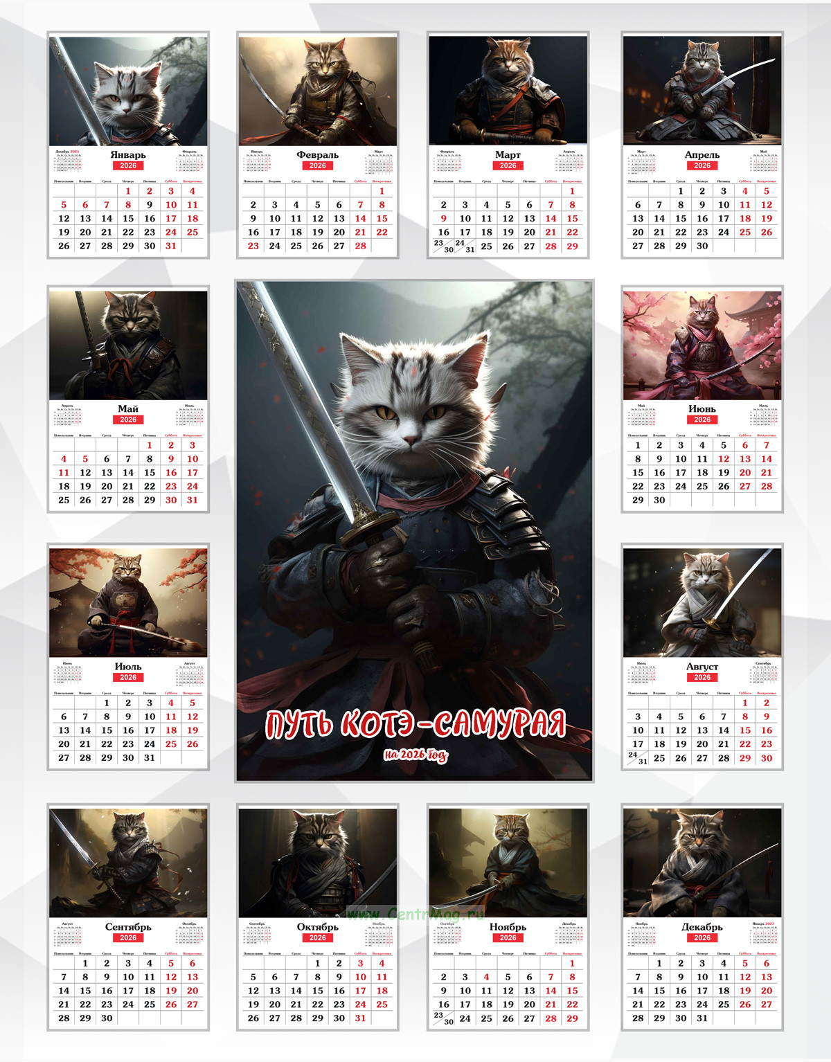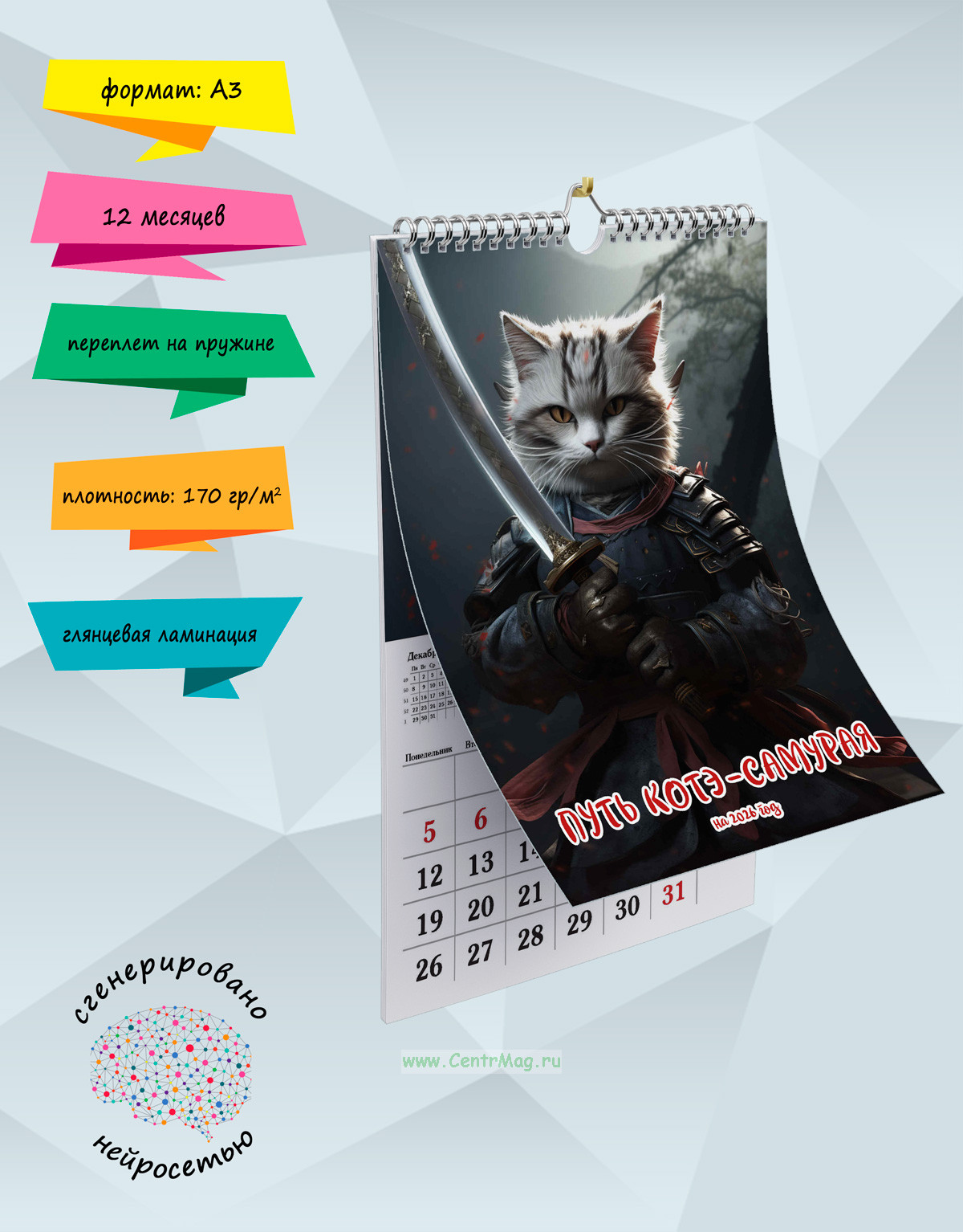 Календарь содержит очаровательные изображения кота-самурая. Иллюстрации созданы с помощью искусственного интеллекта. Идеально подойдет в качестве подарка друзьям, родственникам или даже себе.