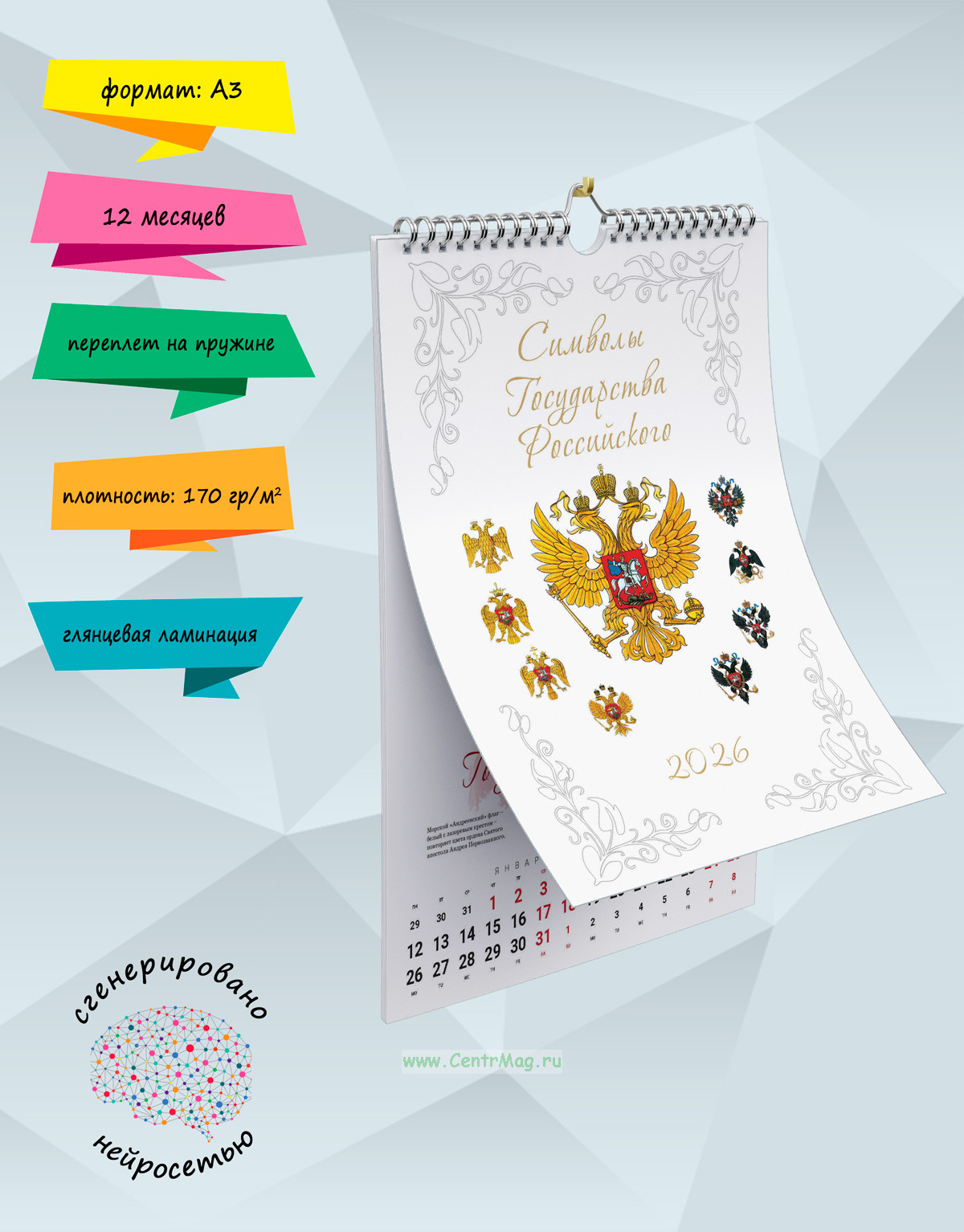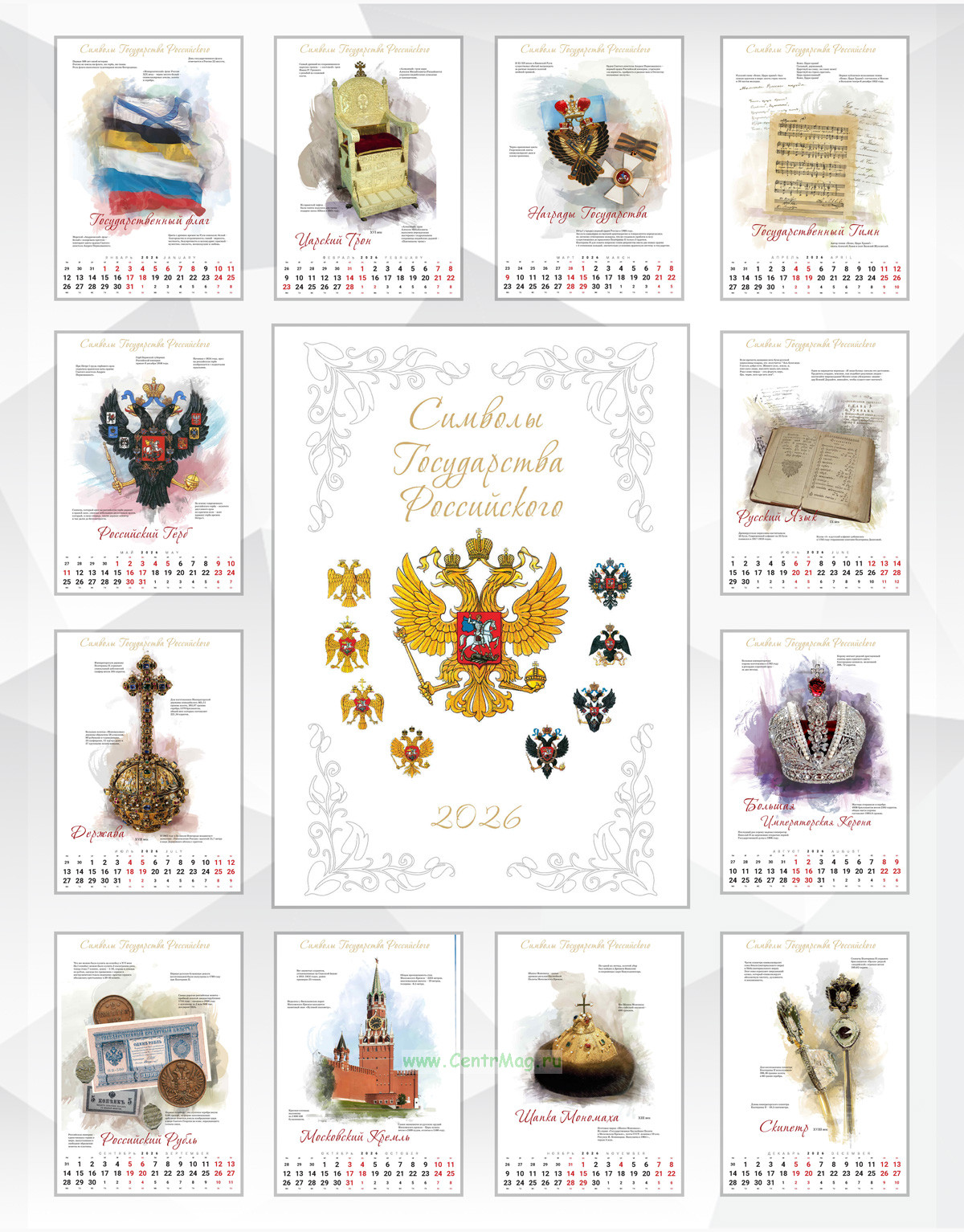 Календарь содержит 13 изображений Символов Государства Российского с краткими описаниями: