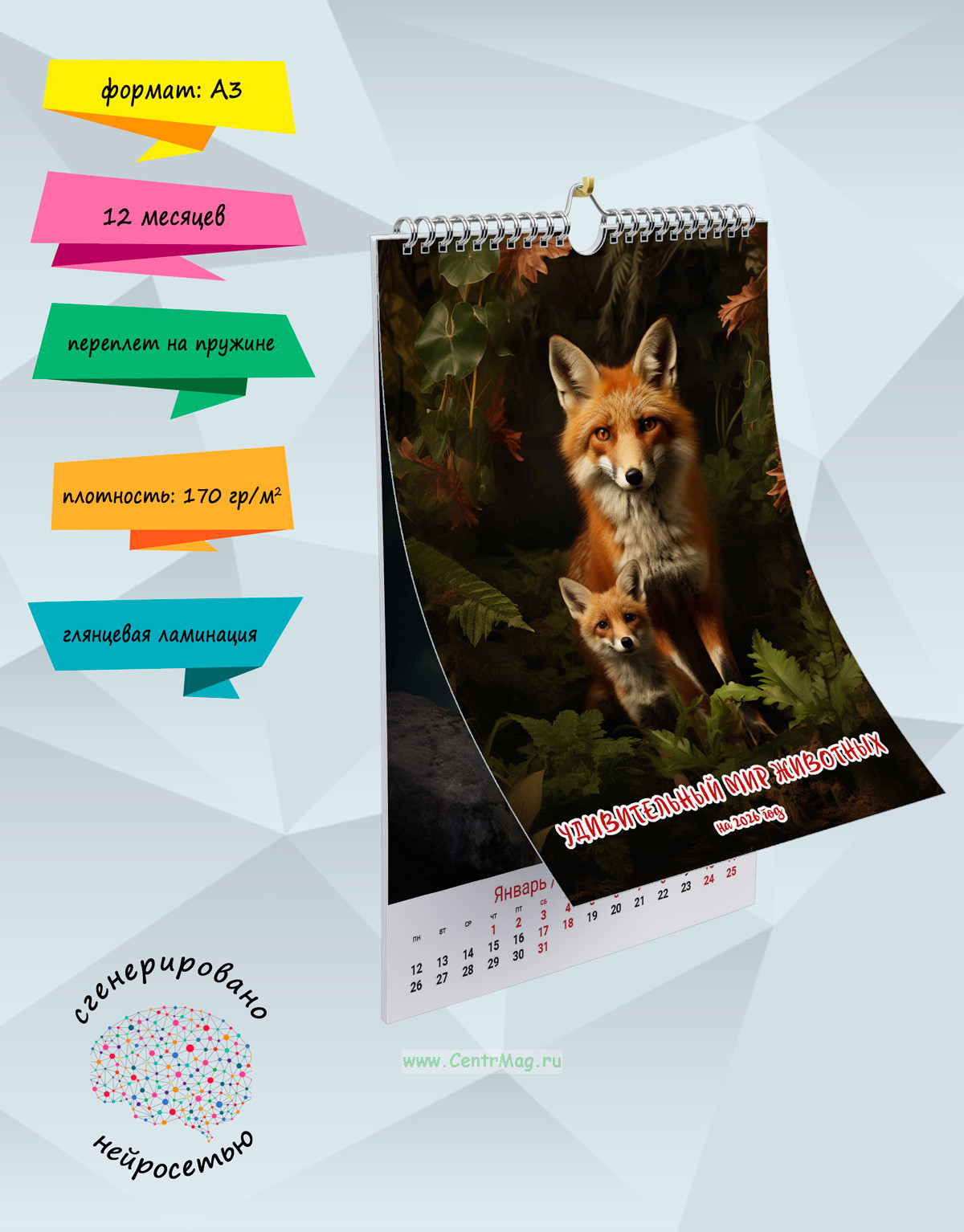 Календарь содержит очаровательные изображения животных. Иллюстрации созданы с помощью искусственного интеллекта. Идеально подойдет в качестве подарка друзьям, родственникам или даже себе.