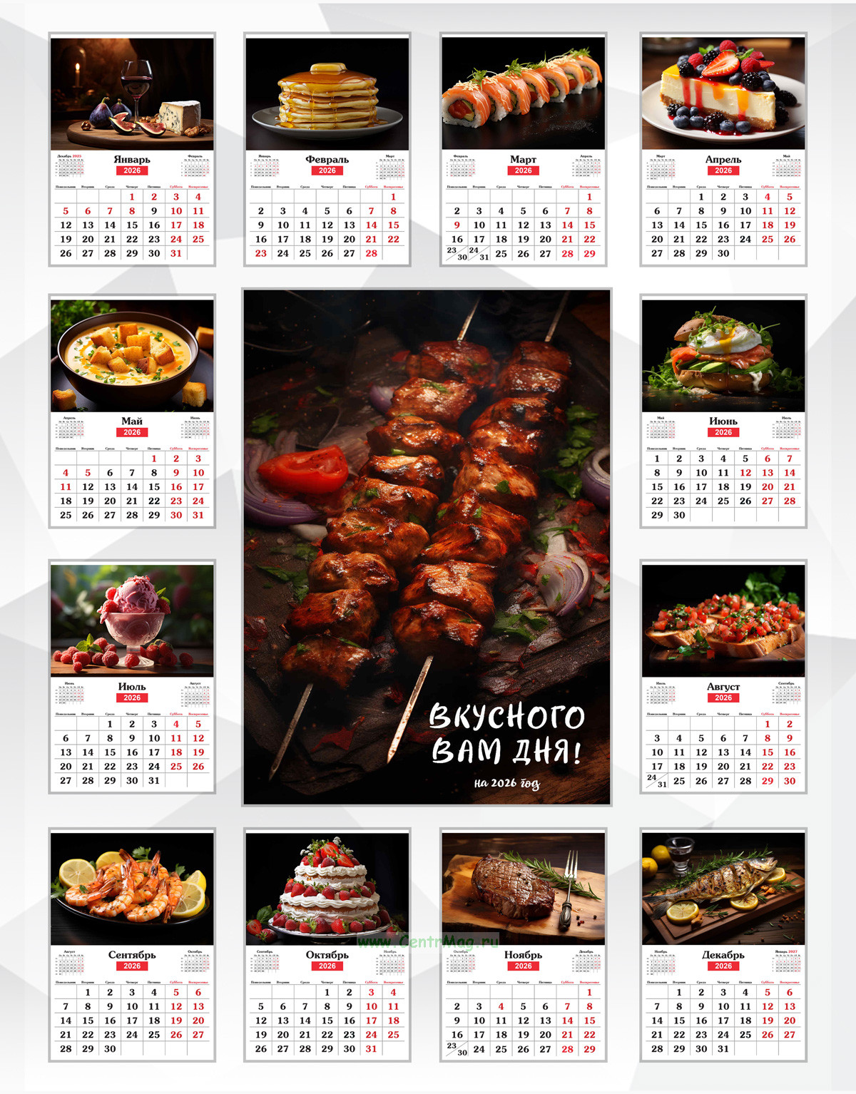 На страницах календаря вы найдете картинки сочного кебаба, бургера, изысканного сыра с вином и инжиром, брускетт, супов, роллов, морепродуктов, стейка, рыбы, панкейков и различных десертов.