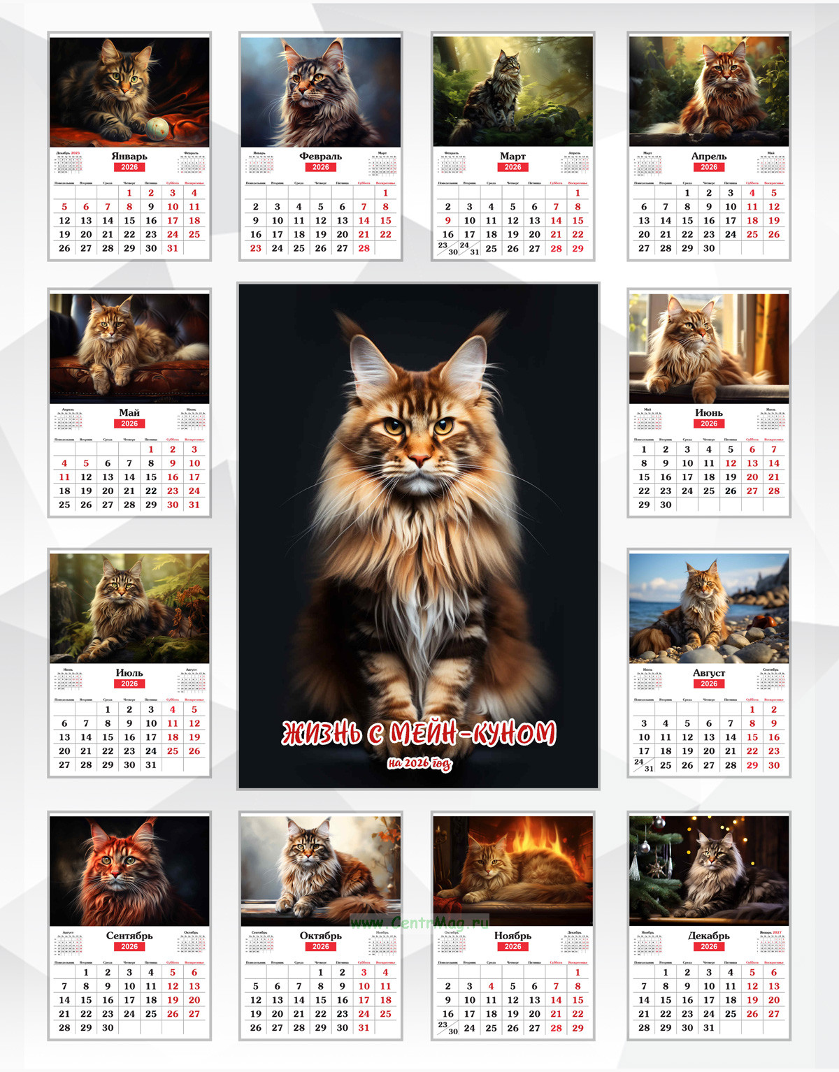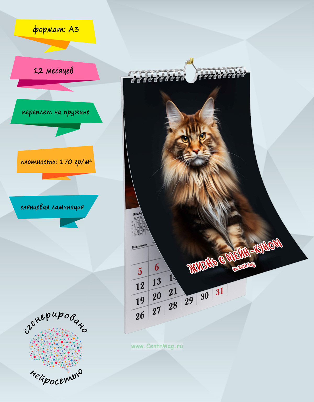 Календарь содержит очаровательные изображения котов породы мейн-кун. Иллюстрации созданы с помощью искусственного интеллекта. Идеально подойдет в качестве подарка друзьям, родственникам или даже себе.