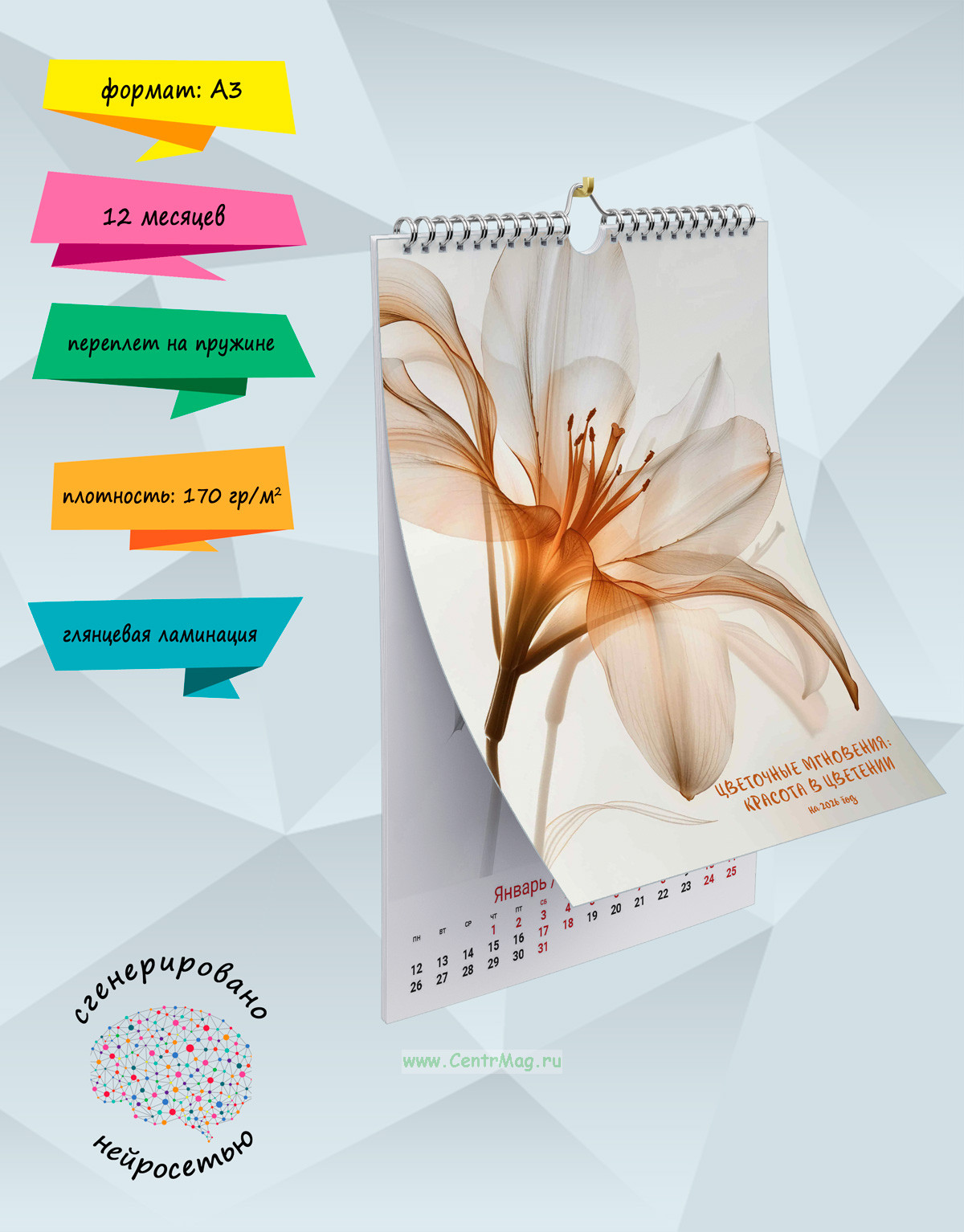 Календарь содержит завораживающие изображения цветов, сгенерированные с помощью нейросети. Календарь будет отличным подарком для ваших родных, друзей, знакомых, коллег или даже для себя.