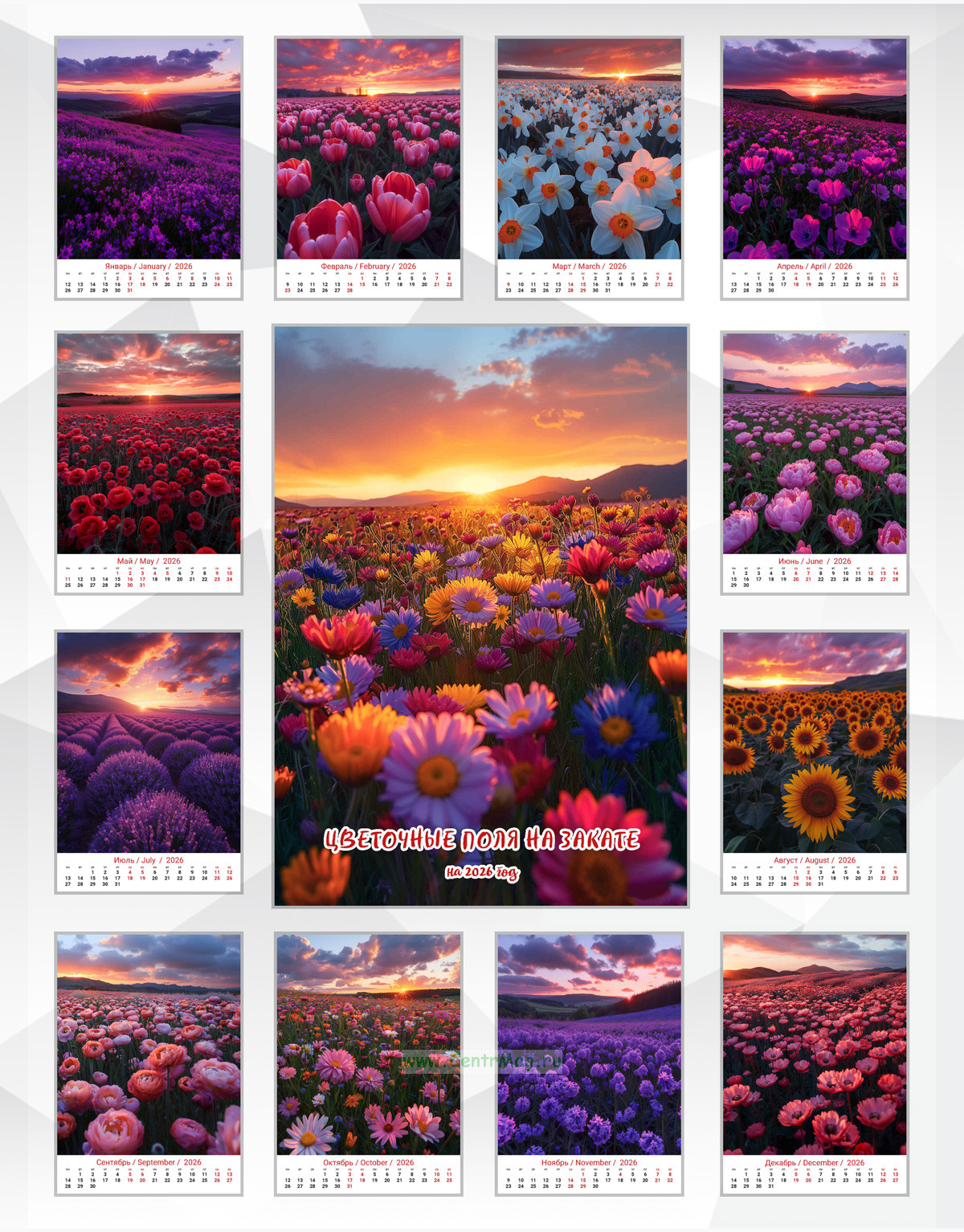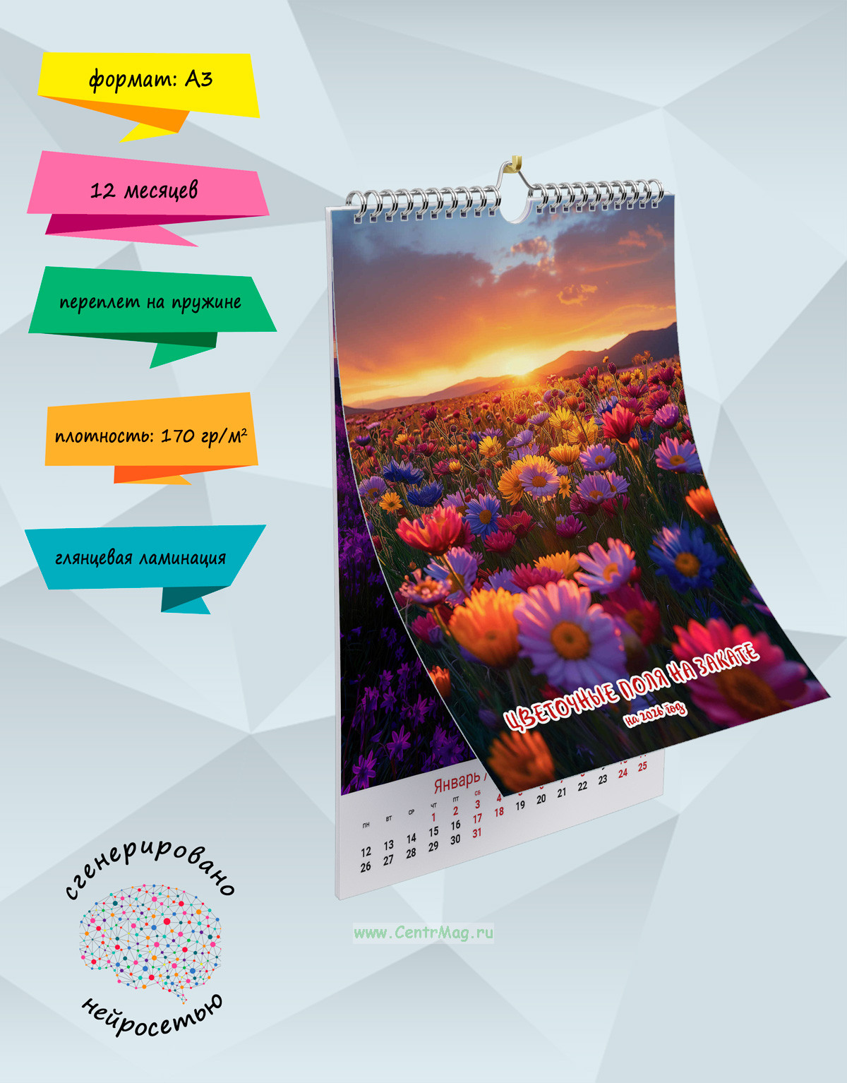 Календарь содержит завораживающие изображения цветочных полей на прекрасном закате, сгенерированные с помощью нейросети. Календарь будет отличным подарком для ваших родных, друзей, знакомых, коллег или даже для себя.