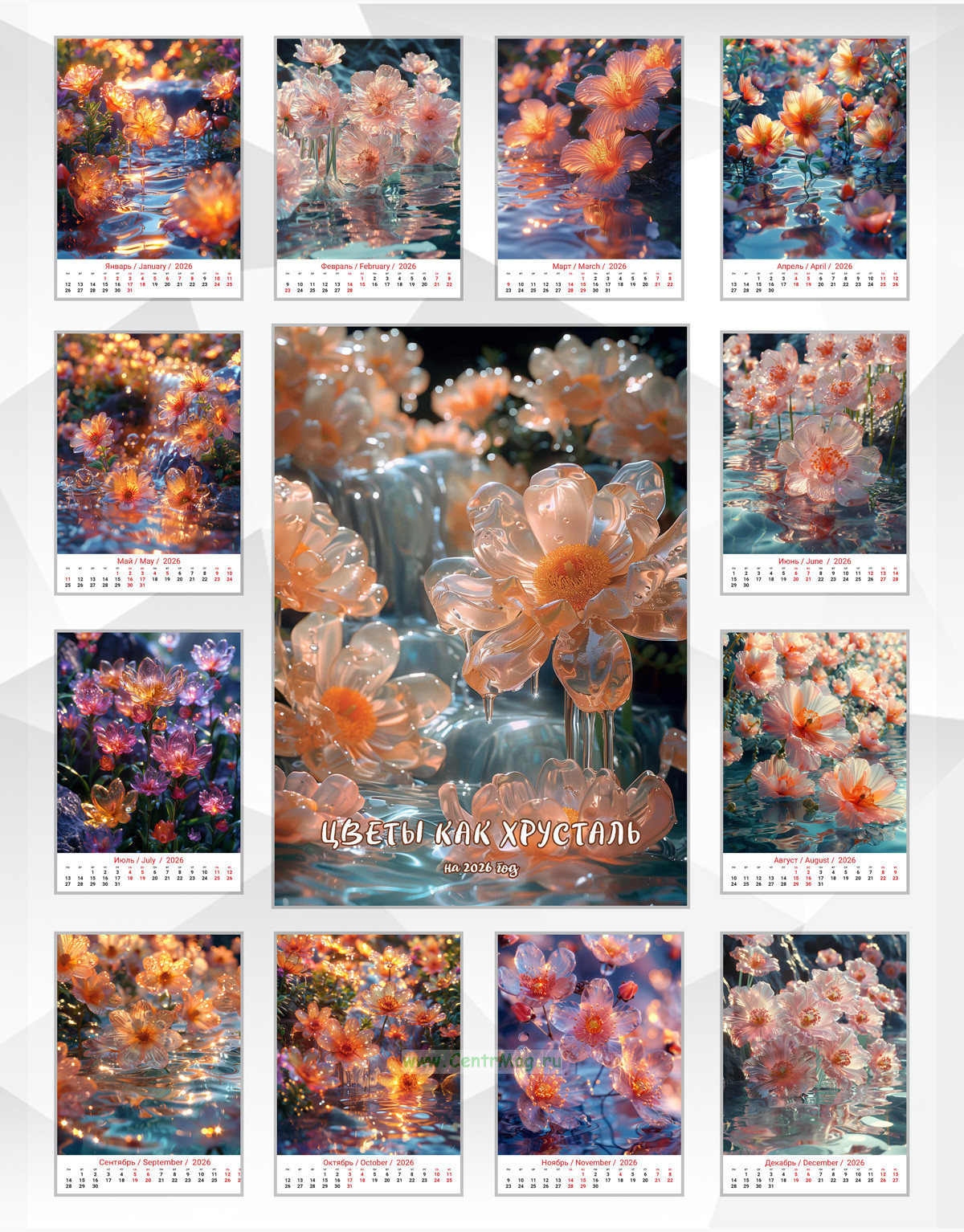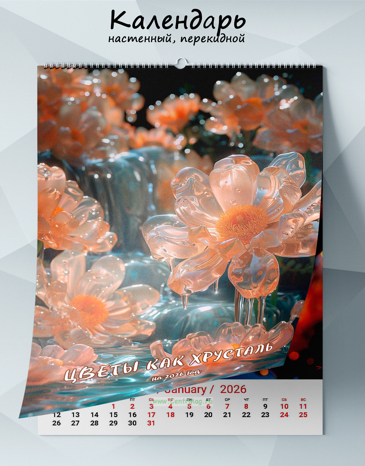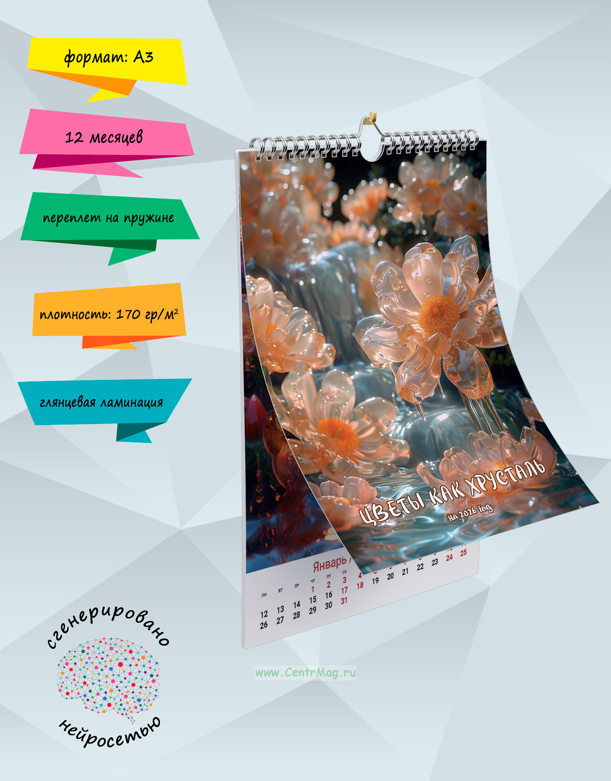 Календарь содержит завораживающие изображения цветов в виде хрусталя, сгенерированные с помощью нейросети. Календарь будет отличным подарком для ваших родных, друзей, знакомых, коллег или даже для себя.