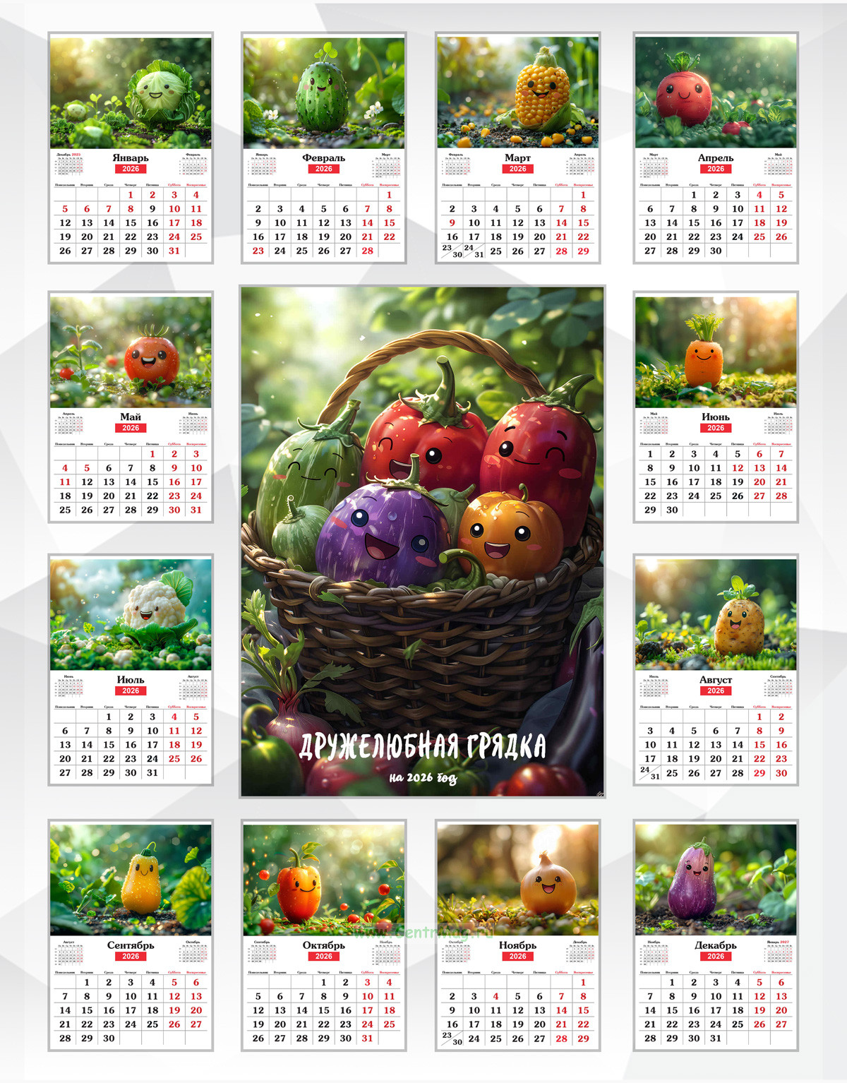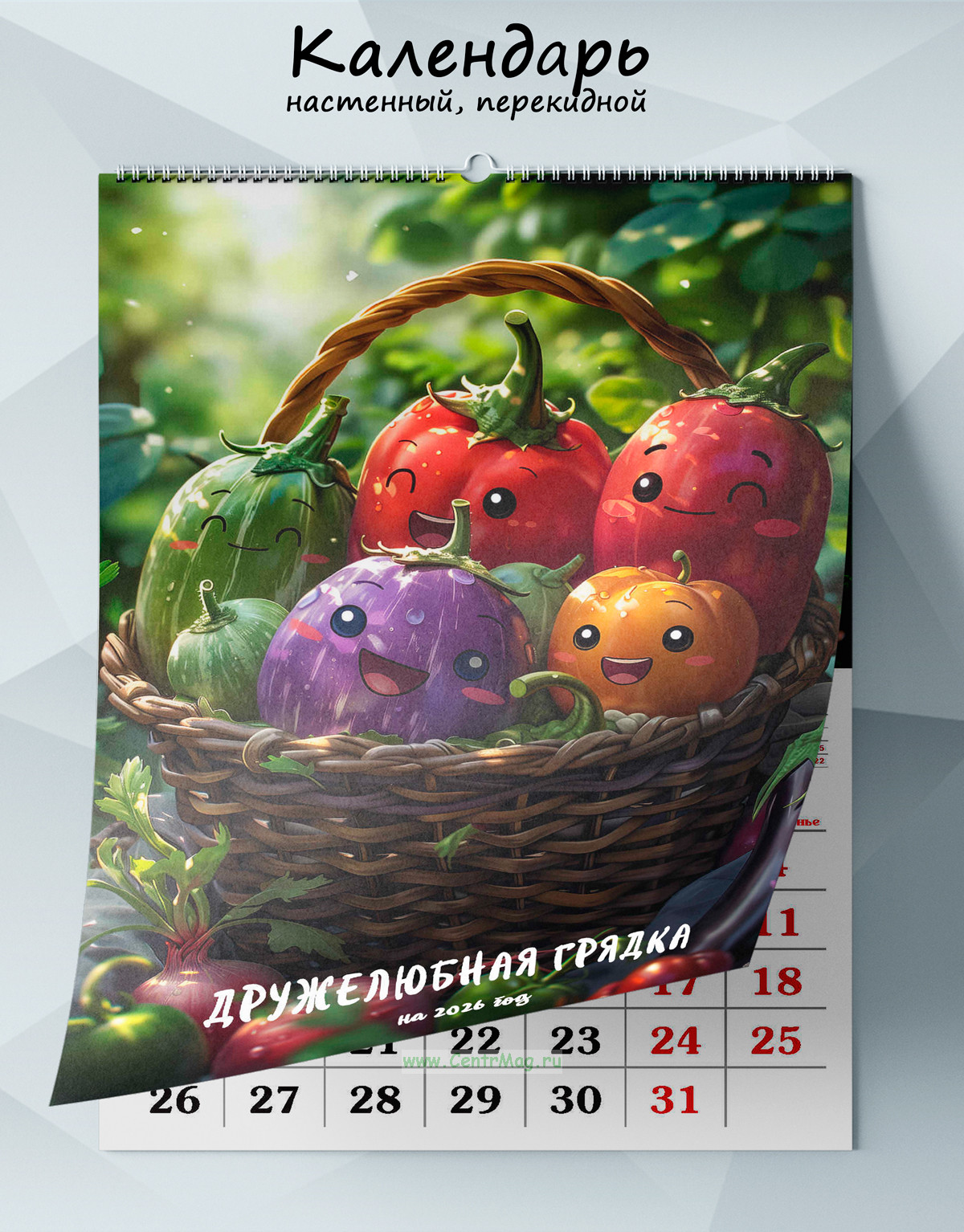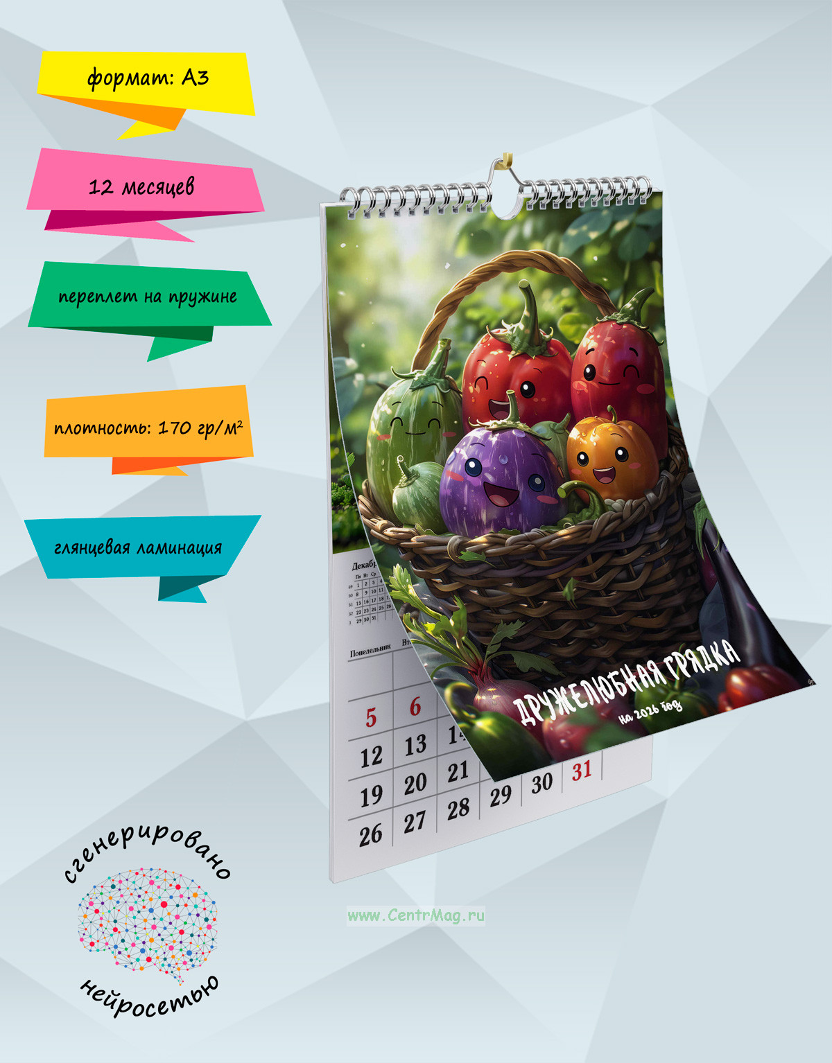 Календарь содержит изображения овощей, но с милыми и улыбчивыми лицами, сгенерированные с помощью нейросети. Календарь будет отличным подарком для ваших родных, друзей, знакомых, коллег или даже для себя.