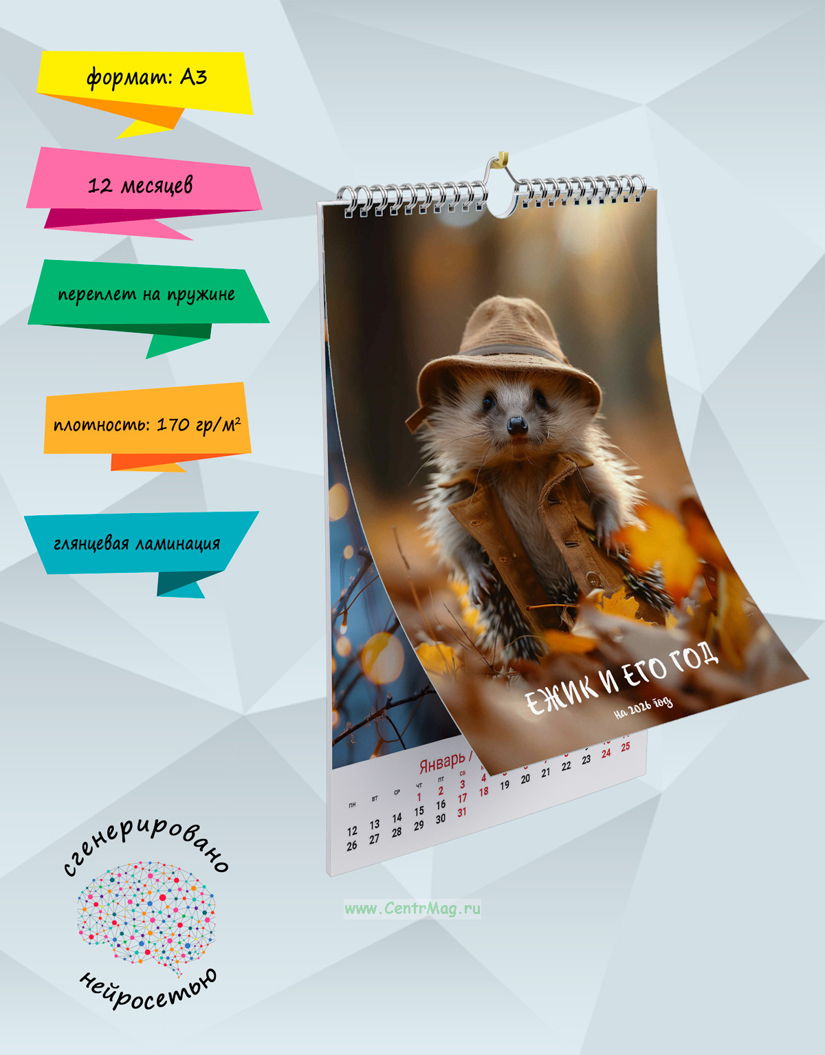 Календарь содержит изображение Ежика, сгенерированные с помощью нейросети, у которого распланирован весь год. Календарь будет отличным подарком для ваших родных, друзей, знакомых, коллег или даже для себя.