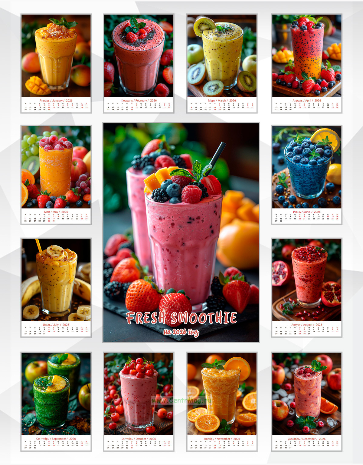 Календарь содержит изображения, очень вкусных напитков смузи из разных фруктовых сочетаний, сгенерированные с помощью нейросети. Календарь будет отличным подарком для ваших родных, друзей, знакомых, коллег или даже для себя.