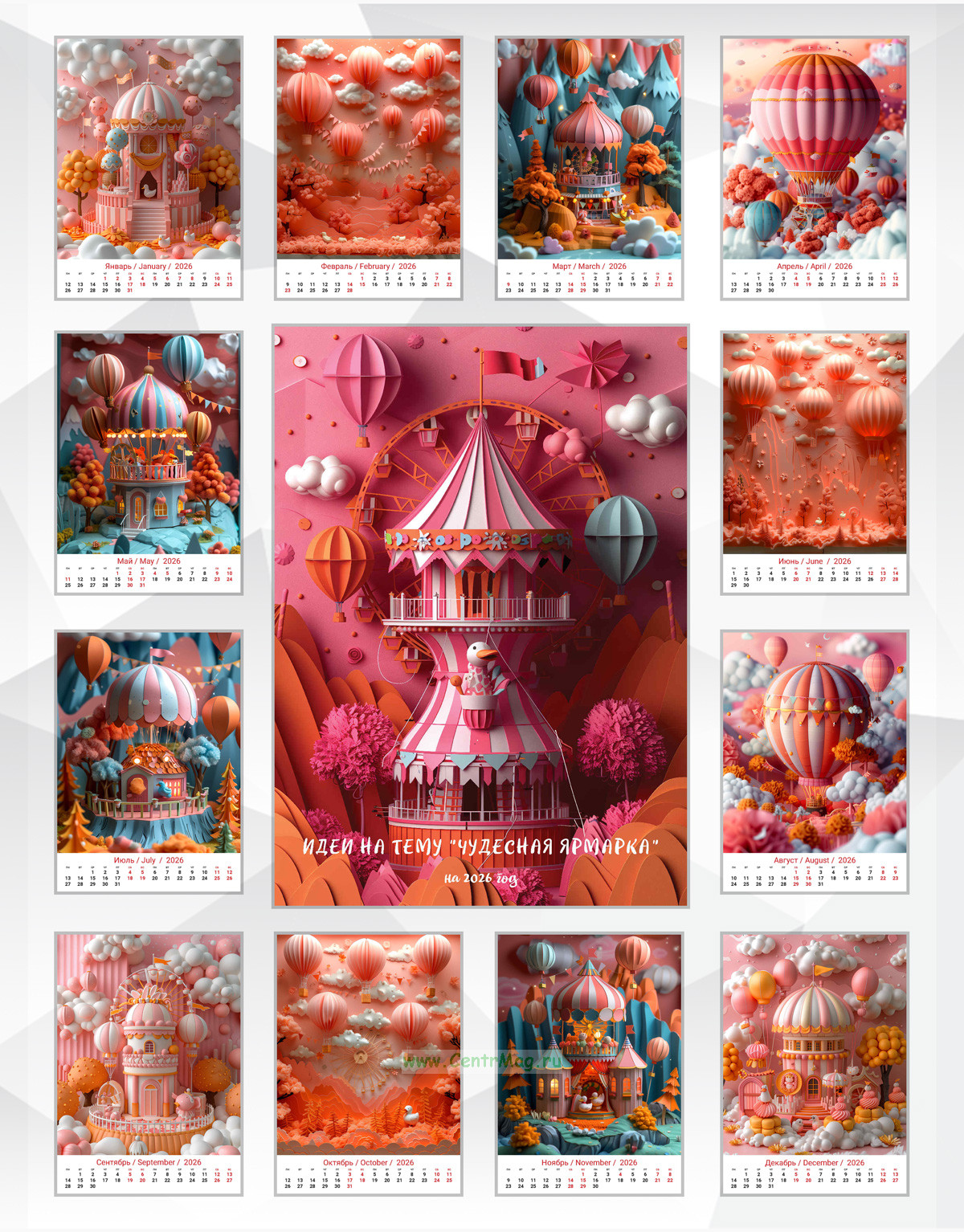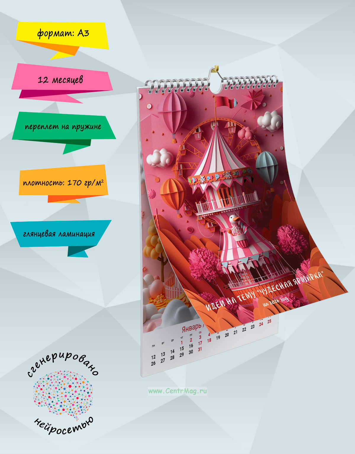 Календарь содержит изображения, наполненные красочными каруселями и весельем и сгенерированные с помощью нейросети. Календарь будет отличным подарком для ваших родных, друзей, знакомых, коллег или даже для себя.