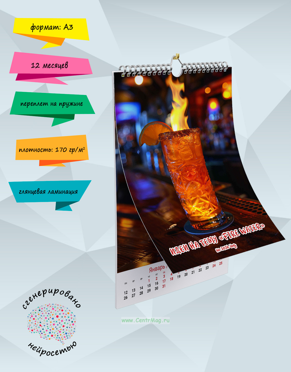 Календарь содержит изображения напитков и огня, для поднятия веселого настроения, сгенерированные с помощью нейросети. Календарь будет отличным подарком для ваших родных, друзей, знакомых, коллег или даже для себя.