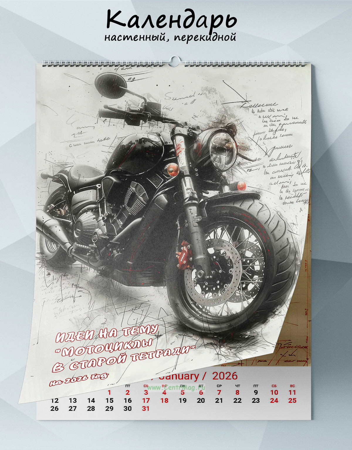 Календарь настенный, перекидной "Идеи на тему "Мотоциклы в старой тетради"" на 2026 год