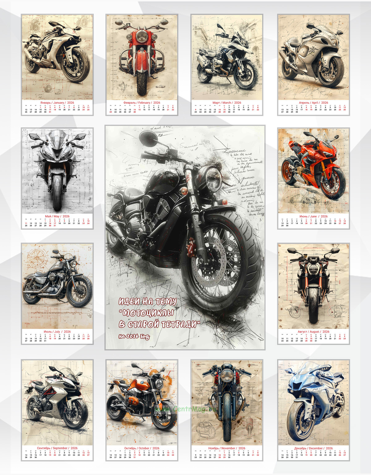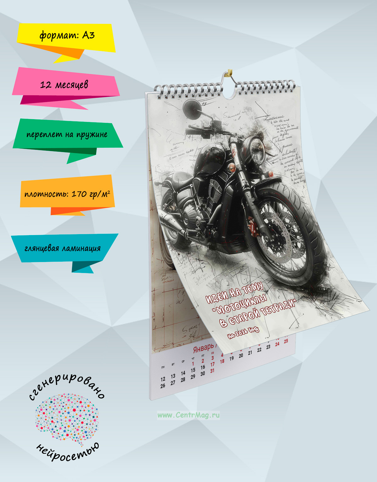 Календарь содержит изображения крутых мотоциклов, сгенерированные с помощью нейросети, выполненных в старой тетрадке. Календарь будет отличным подарком для ваших родных, друзей, знакомых, коллег или даже для себя.