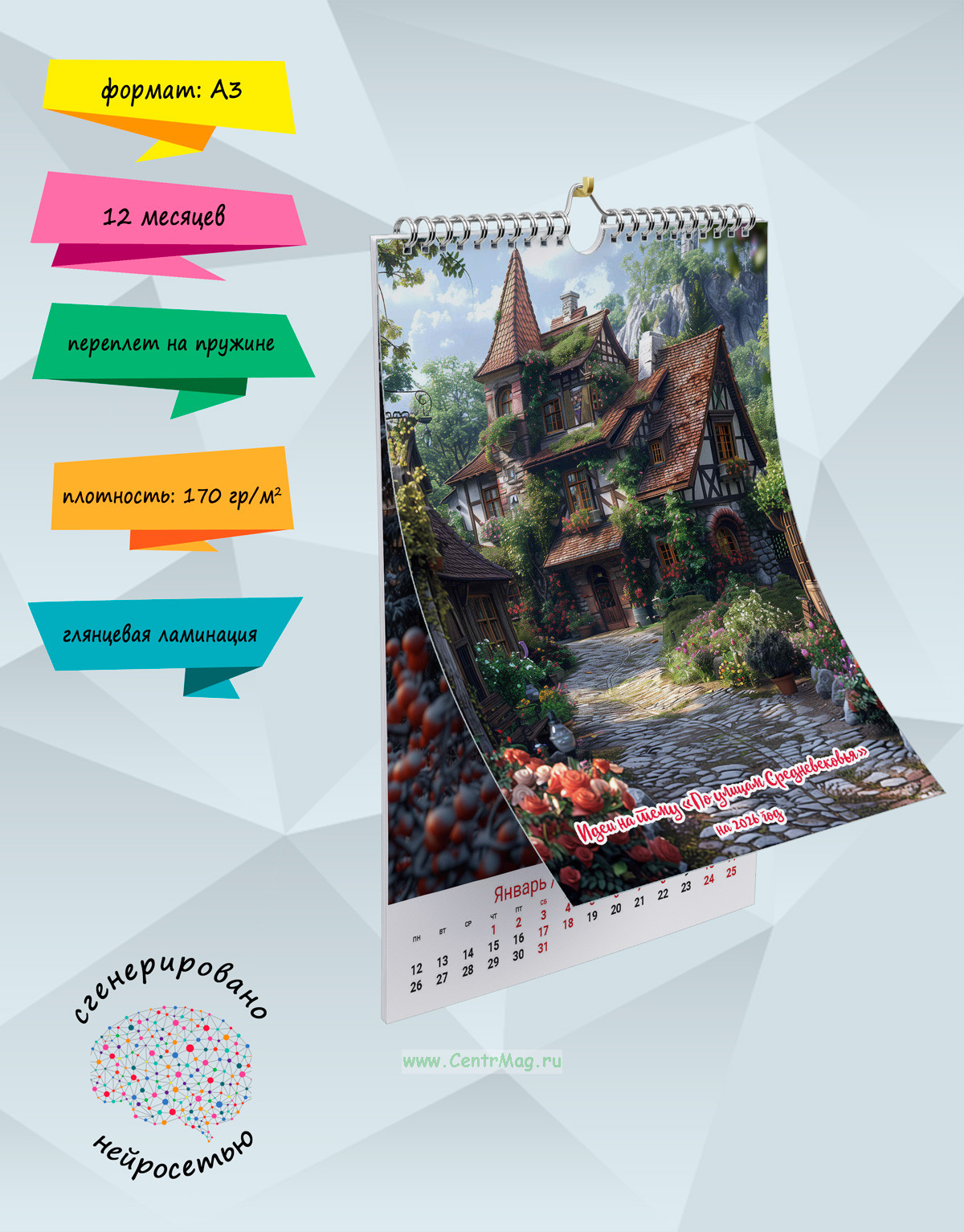 Календарь содержит изображения уютной деревушки времен Средневековья, сгенерированные с помощью нейросети. Календарь будет отличным подарком для ваших родных, друзей, знакомых, коллег или даже для себя.
