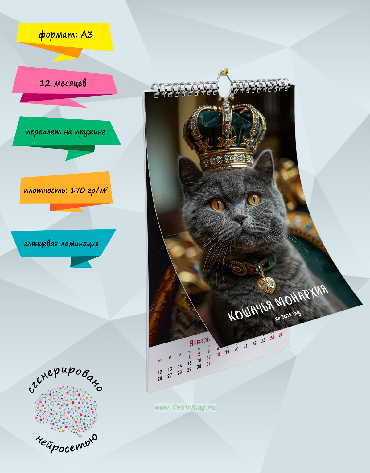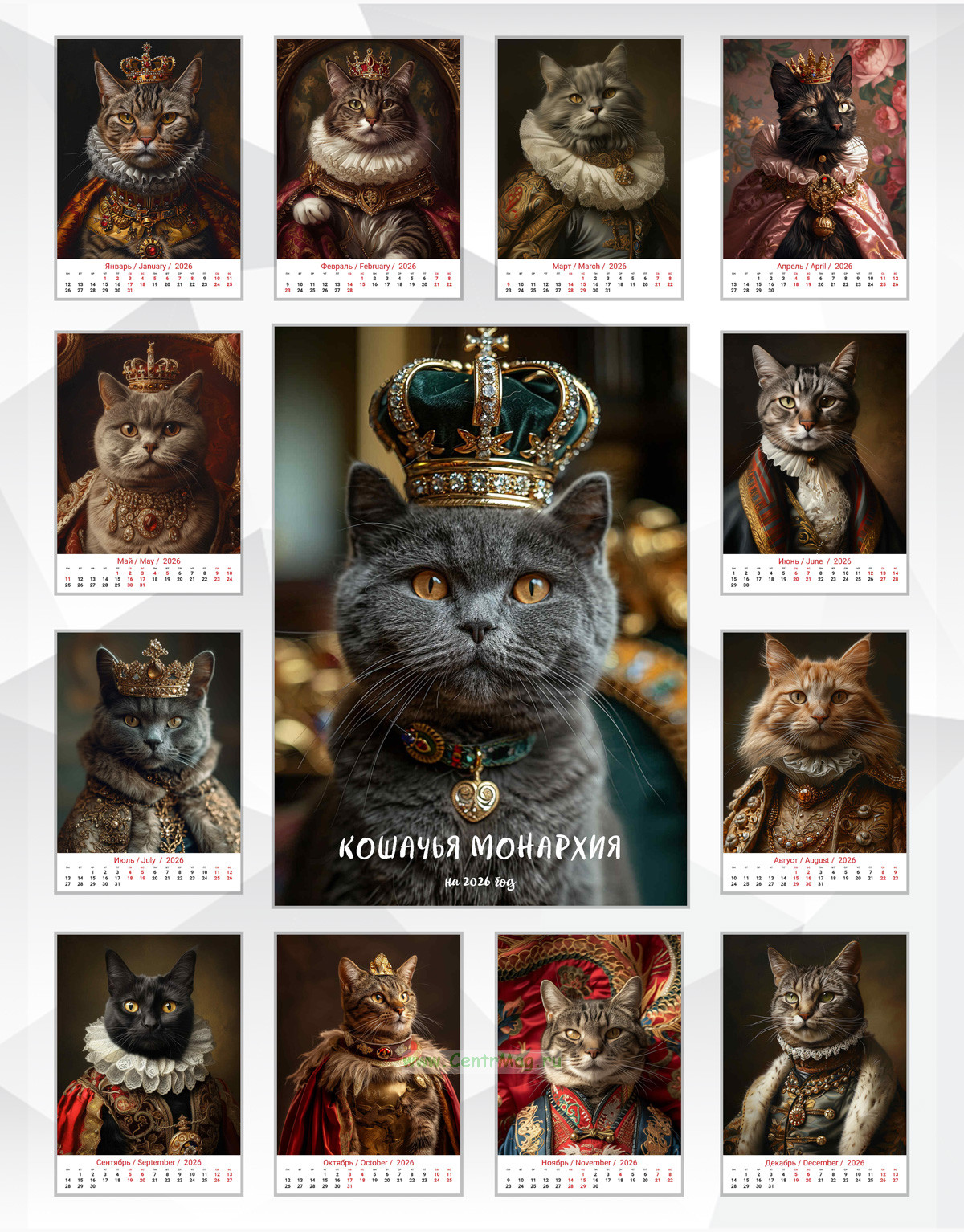 Календарь содержит изображения котиков королевского происхождения, сгенерированные с помощью нейросети. Календарь будет отличным подарком для ваших родных, друзей, знакомых, коллег или даже для себя.