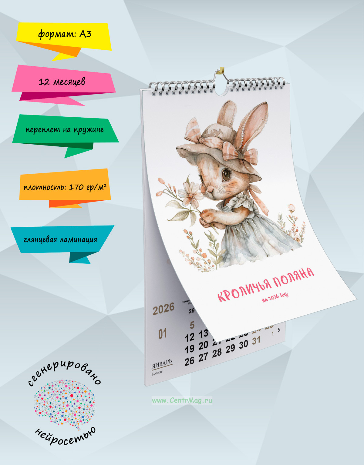 Календарь содержит изображения мультяшных кроликов, сгенерированные с помощью нейросети, которые выглядят очень интеллигентно. Календарь будет отличным подарком для ваших родных, друзей, знакомых, коллег или даже для себя.
