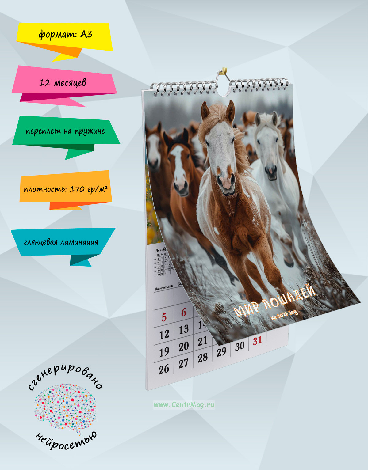 Календарь содержит изображения лошадей, во всей их красоте и грациозности, сгенерированные с помощью нейросети. Календарь будет отличным подарком для ваших родных, друзей, знакомых, коллег или даже для себя.