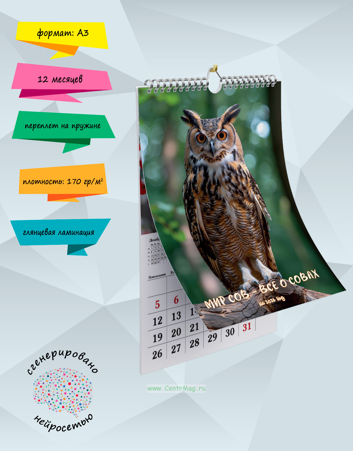 Календарь содержит изображения прекрасных, величественных и мудрых птиц - сов, сгенерированные с помощью нейросети. Календарь будет отличным подарком для ваших родных, друзей, знакомых, коллег или даже для себя.