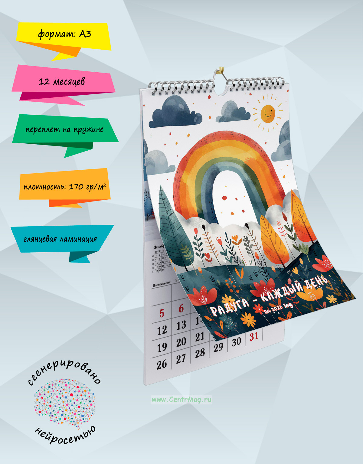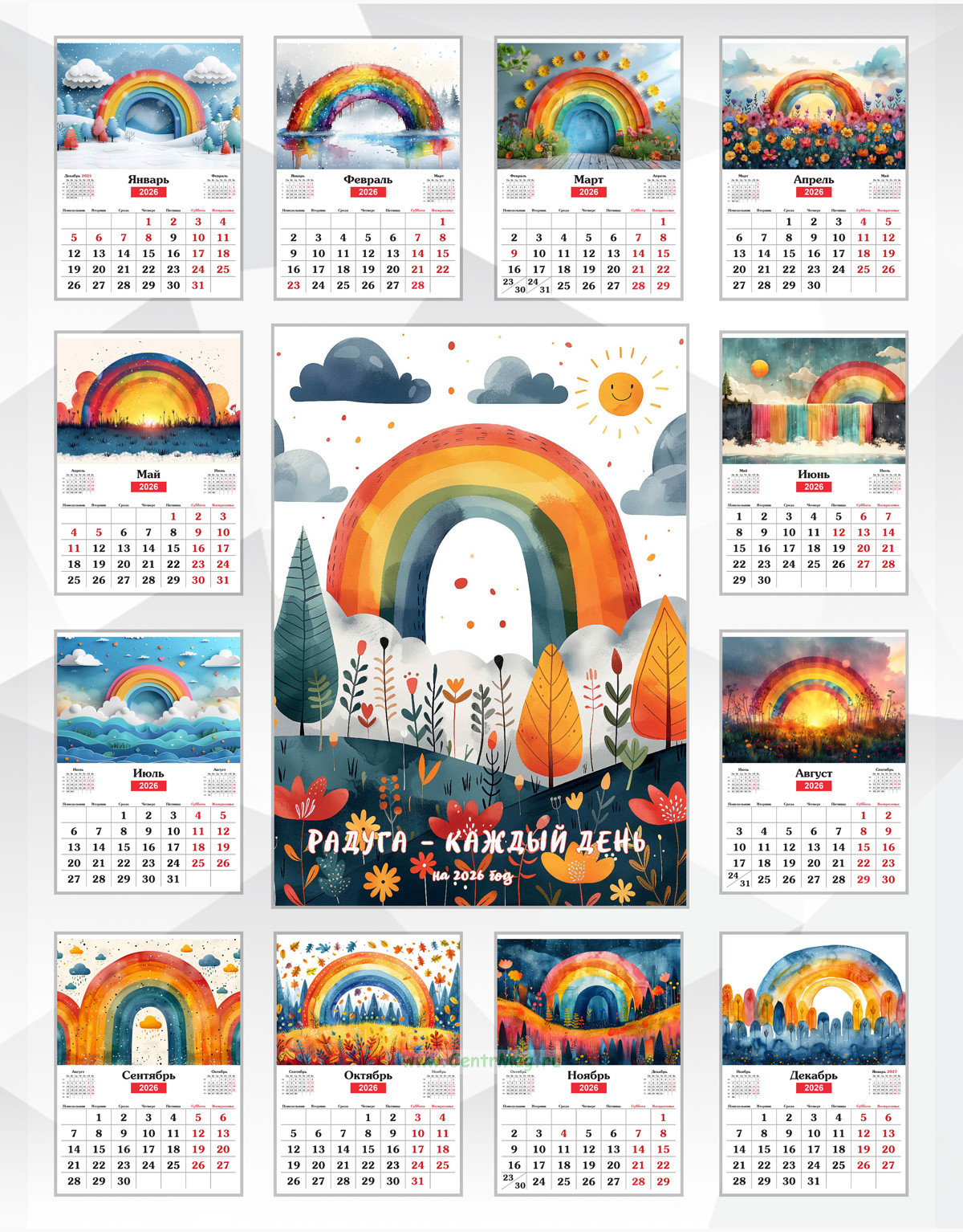Календарь содержит изображения радуги в разном стиле и в разную пору года, сгенерированные с помощью нейросети. Календарь будет отличным подарком для ваших родных, друзей, знакомых, коллег или даже для себя.