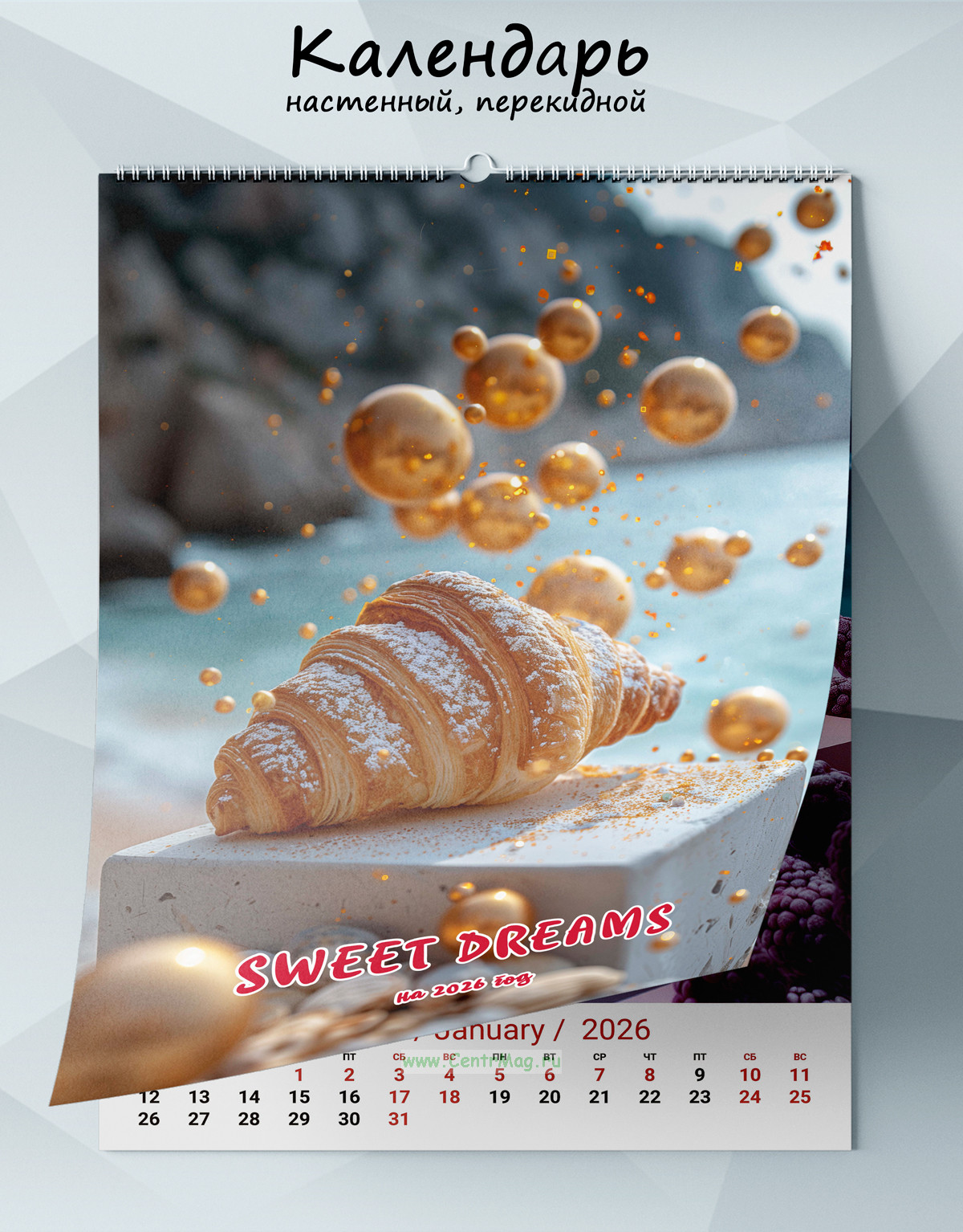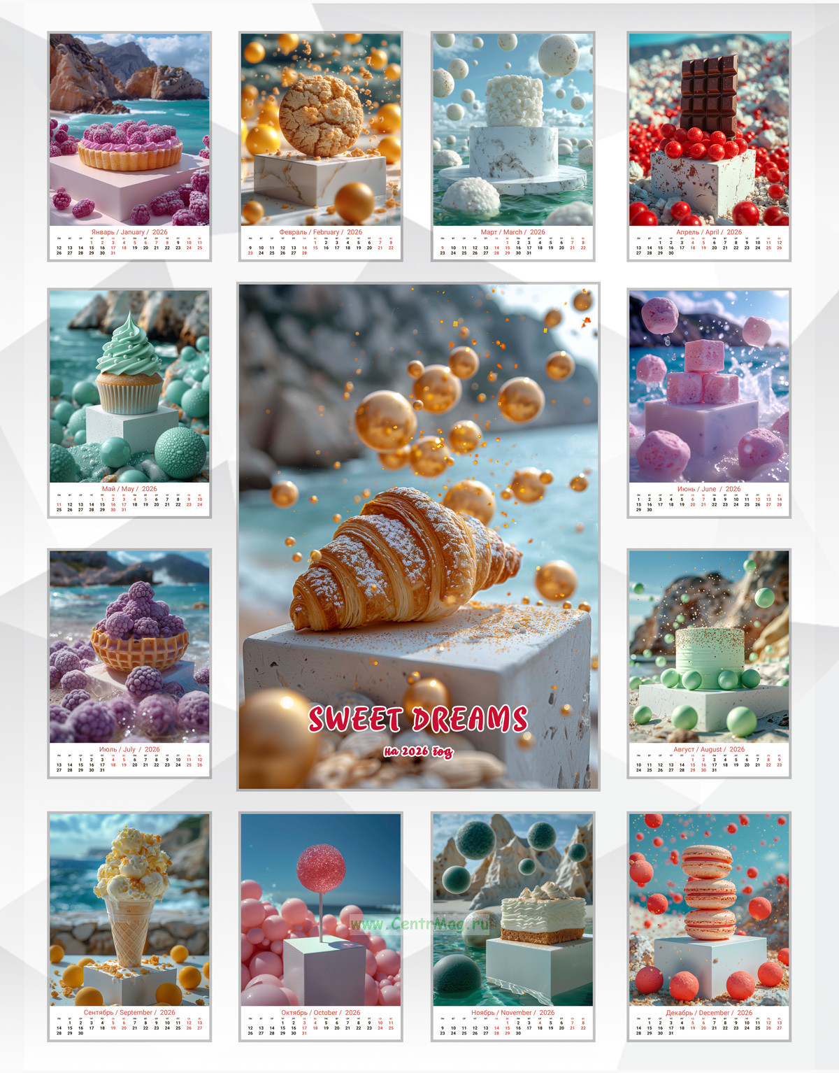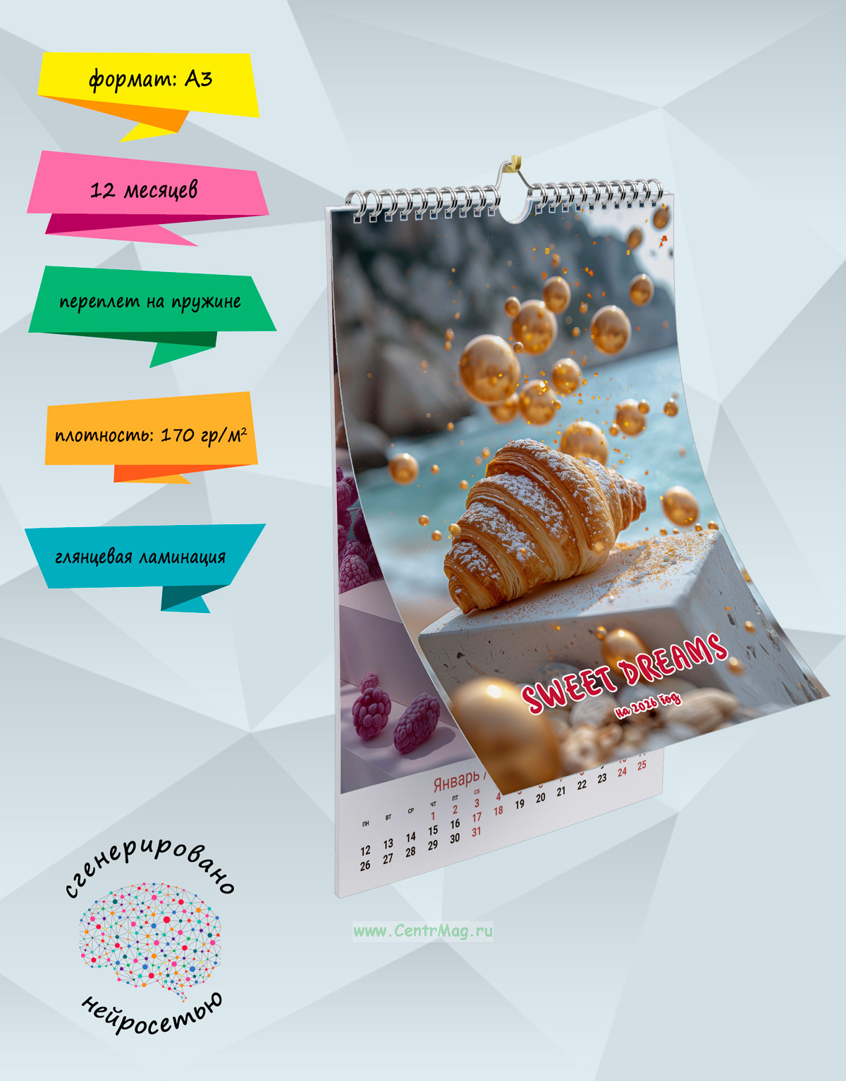 Календарь содержит изображения вкусных сладостей, сгенерированные с помощью нейросети. Календарь будет отличным подарком для ваших родных, друзей, знакомых, коллег или даже для себя.