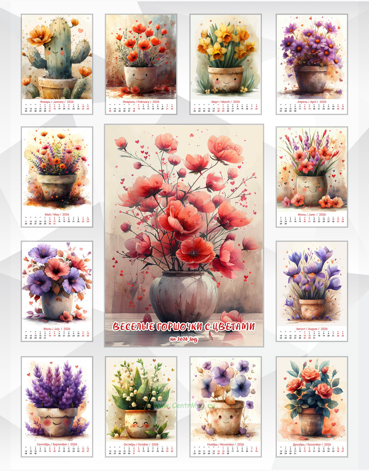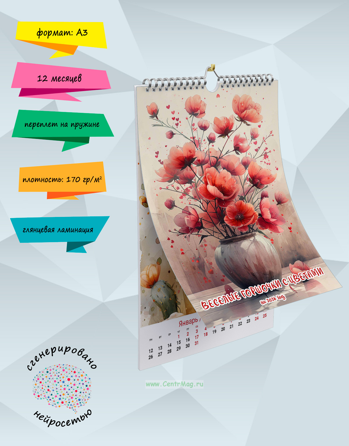 Календарь содержит иллюстрации цветов в милых горшочках, сгенерированные с помощью нейросети. Календарь будет отличным подарком для ваших родных, друзей, знакомых, коллег или даже для себя.