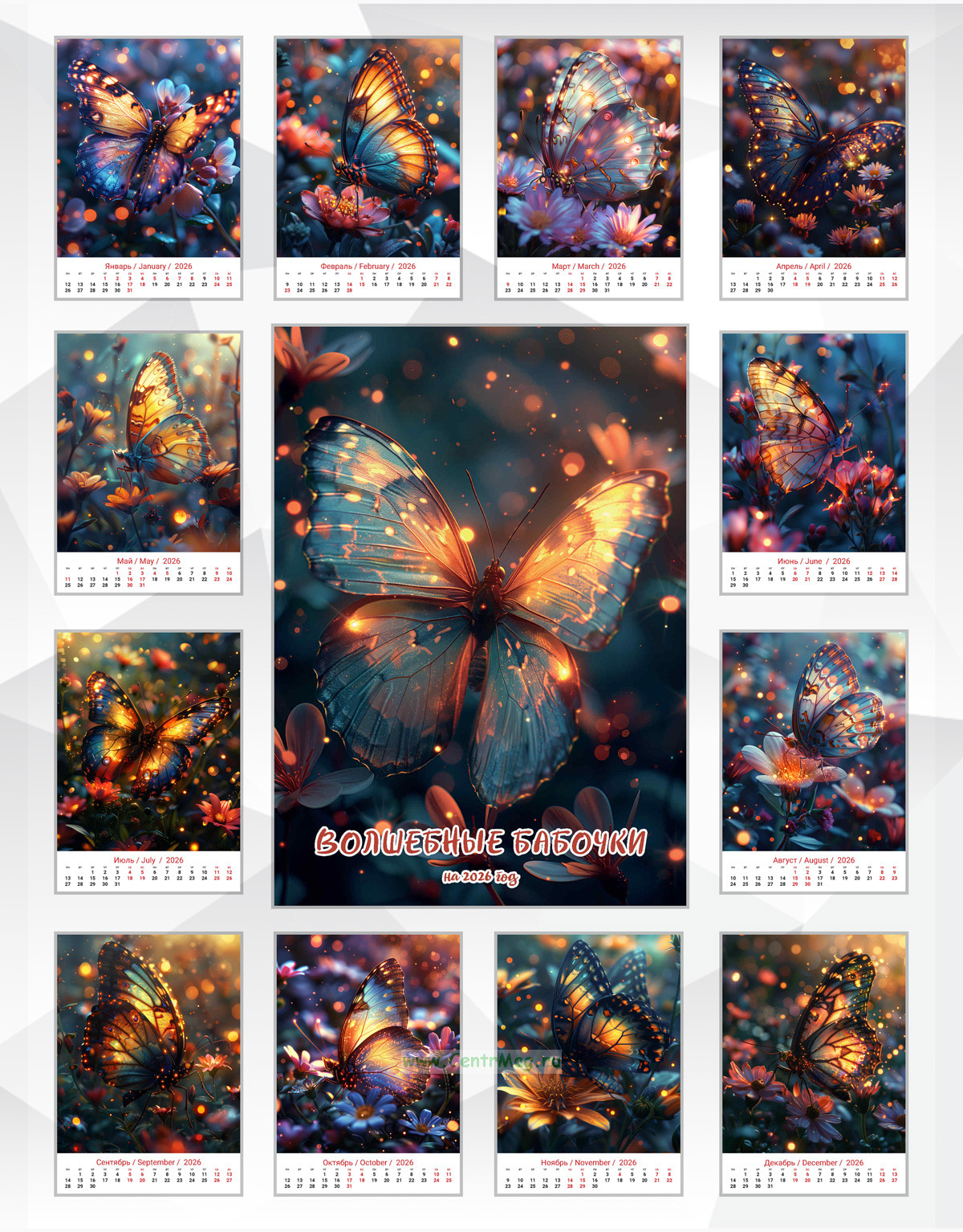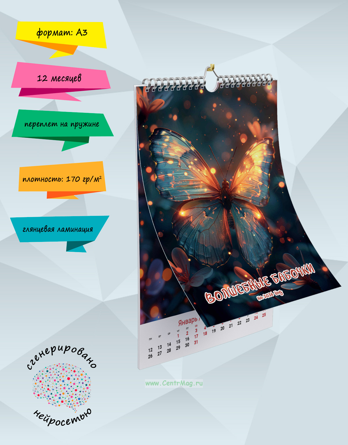 Календарь содержит завораживающие изображения бабочек, сгенерированные с помощью нейросети, которые порхают и светятся. Календарь будет отличным подарком для ваших родных, друзей, знакомых, коллег или даже для себя.