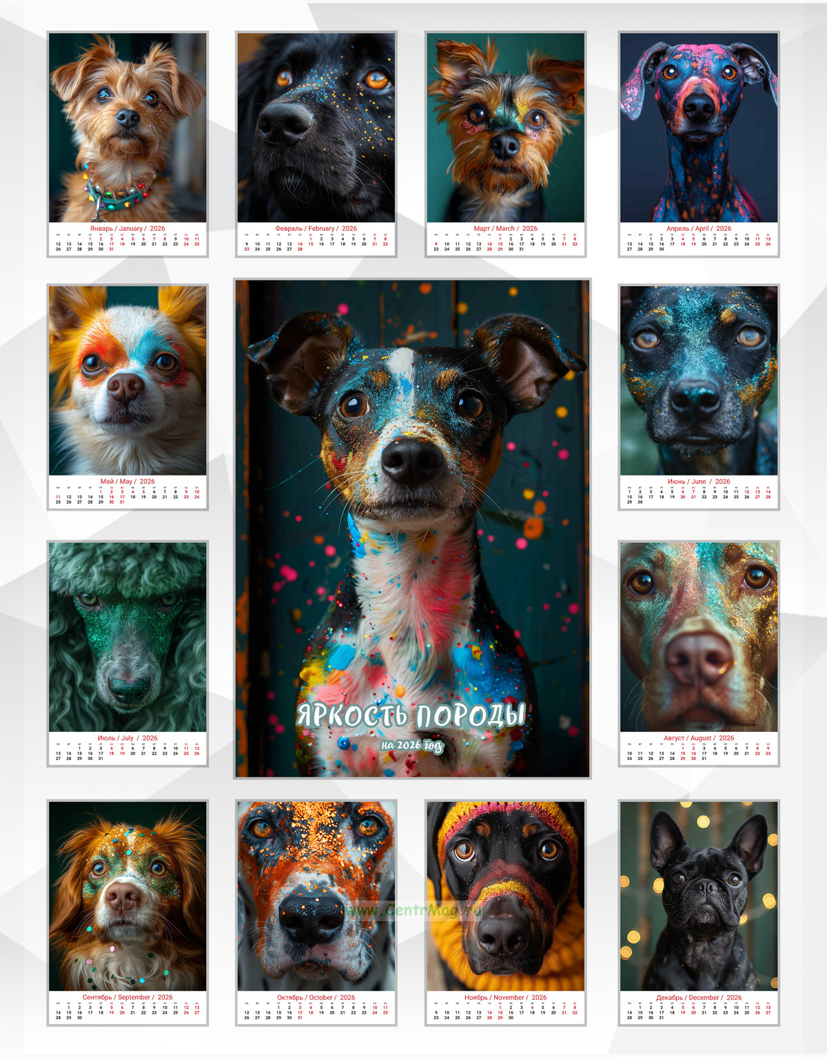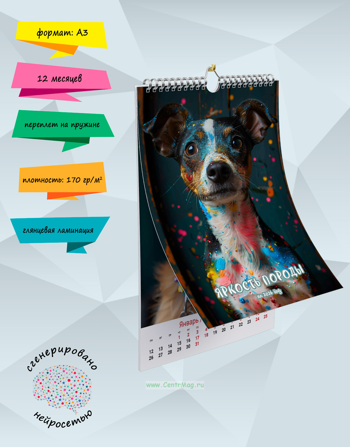 Календарь содержит завораживающие изображения разных пород собак в ярких красках, сгенерированные с помощью нейросети. Календарь будет отличным подарком для ваших родных, друзей, знакомых, коллег или даже для себя.