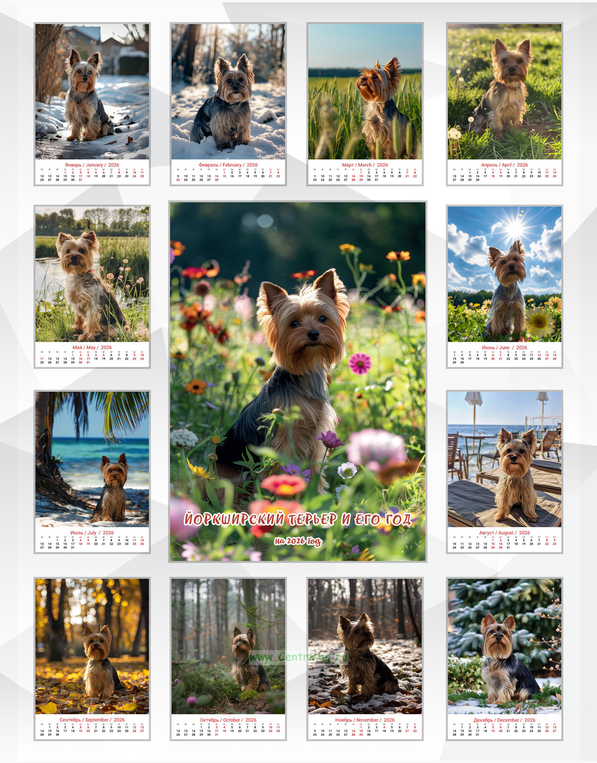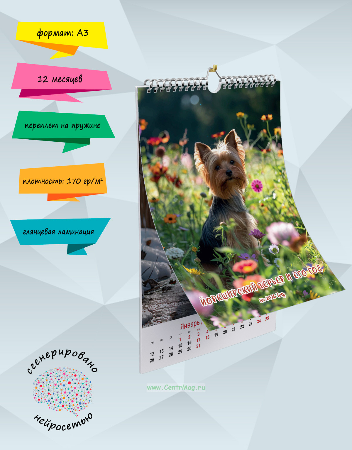 Календарь содержит изображение Йоркширского терьера, сгенерированные с помощью нейросети, у которого распланирован весь год. Календарь будет отличным подарком для ваших родных, друзей, знакомых, коллег или даже для себя.