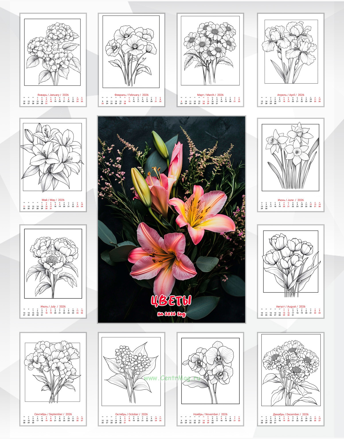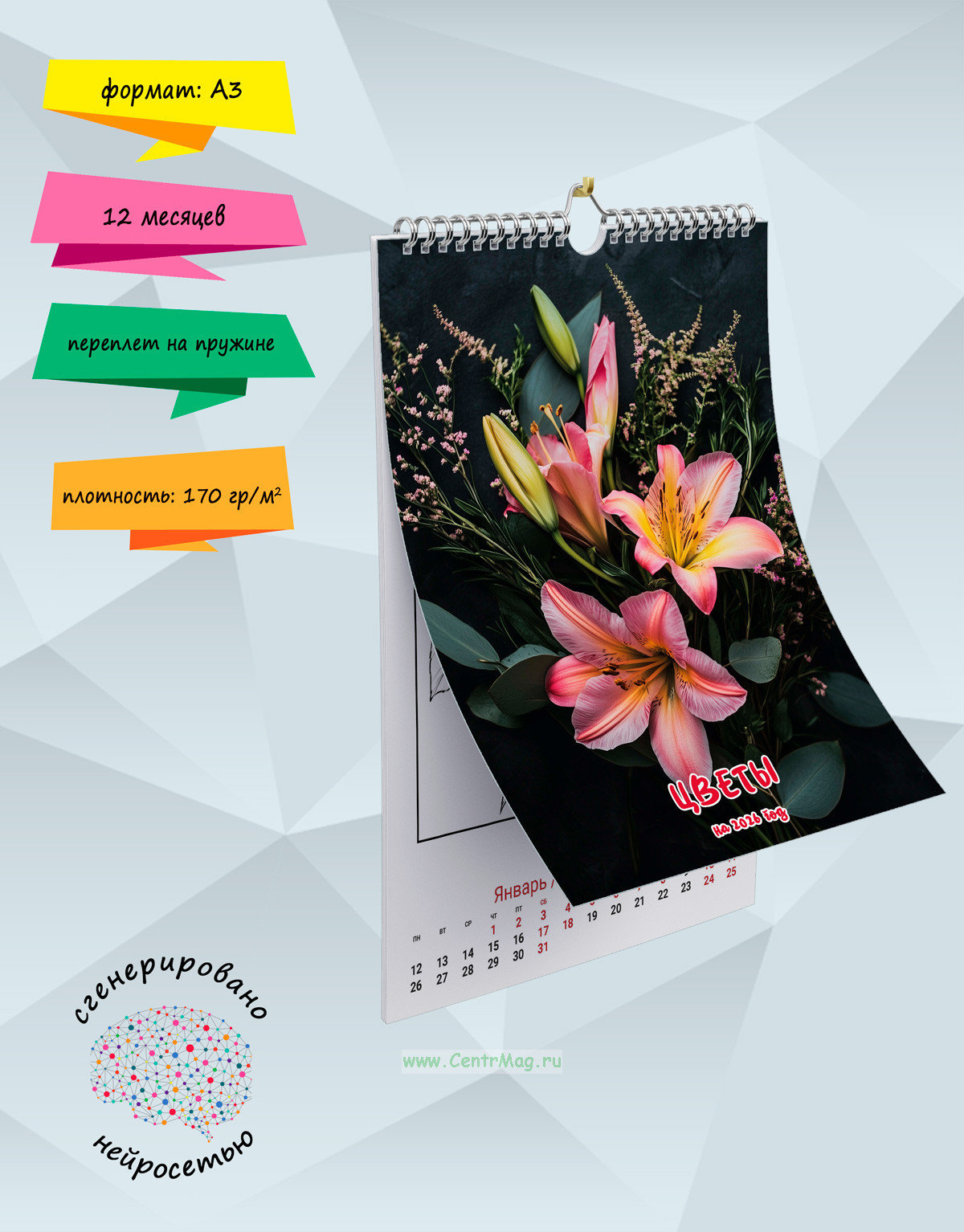 Календарь-раскраска содержит изображения различных цветов, сгенерированные с помощью нейросети. Листы можно раскрасить: карандашами, фломастерами, цветными ручками, красками. Календарь будет отличным подарком для ваших родных, друзей, знакомых, коллег или даже для себя.