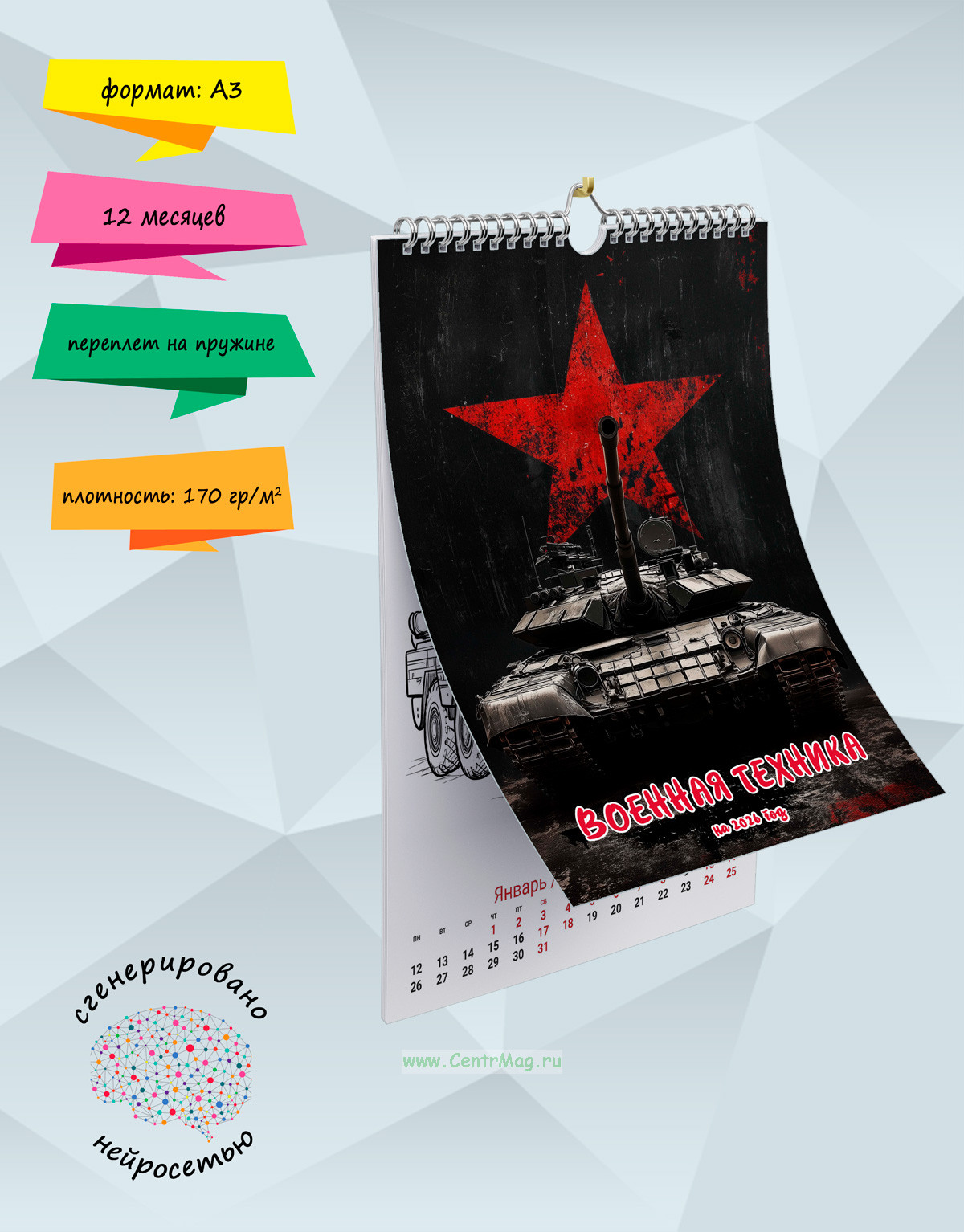 Календарь-раскраска содержит изображения армейской техники, боевых систем, авиации, сгенерированные с помощью нейросети. Листы можно раскрасить: карандашами, фломастерами, цветными ручками, красками. Календарь будет отличным подарком для ваших родных, друзей, знакомых, коллег или даже для себя.