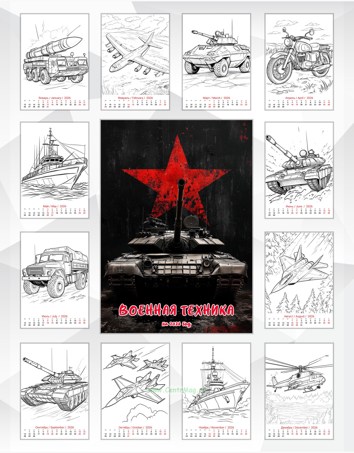 Календарь-раскраска настенный, перекидной "Военная техника" на 2026 год