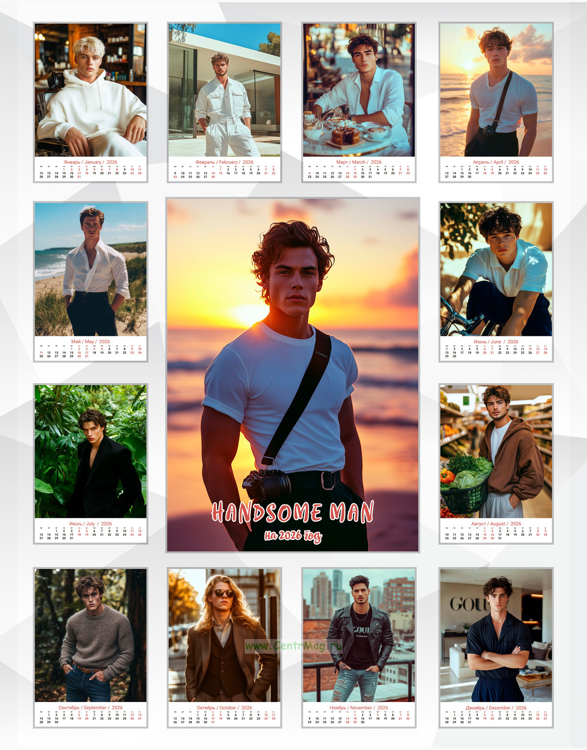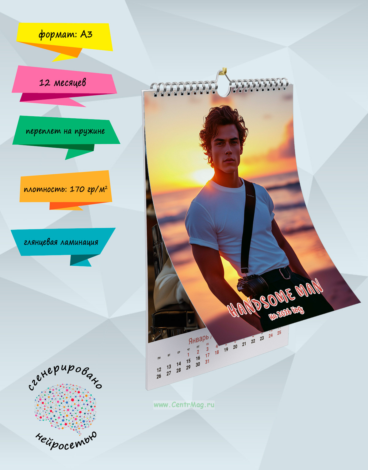 Календарь содержит изображения красивых и харизматичных мужчин, сгенерированные с помощью нейросети. Календарь будет отличным подарком для ваших родных, друзей, знакомых, коллег или даже для себя.
