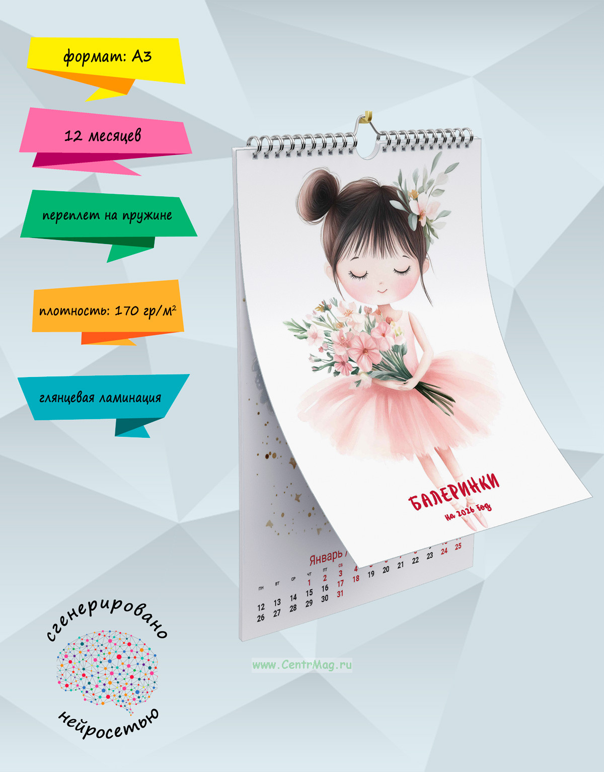 Календарь содержит изображения маленьких симпатичных балеринок, сгенерированные с помощью нейросети. Календарь будет отличным подарком для ваших родных, друзей, знакомых, коллег или даже для себя.