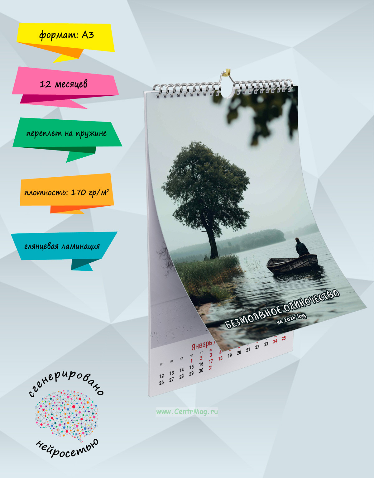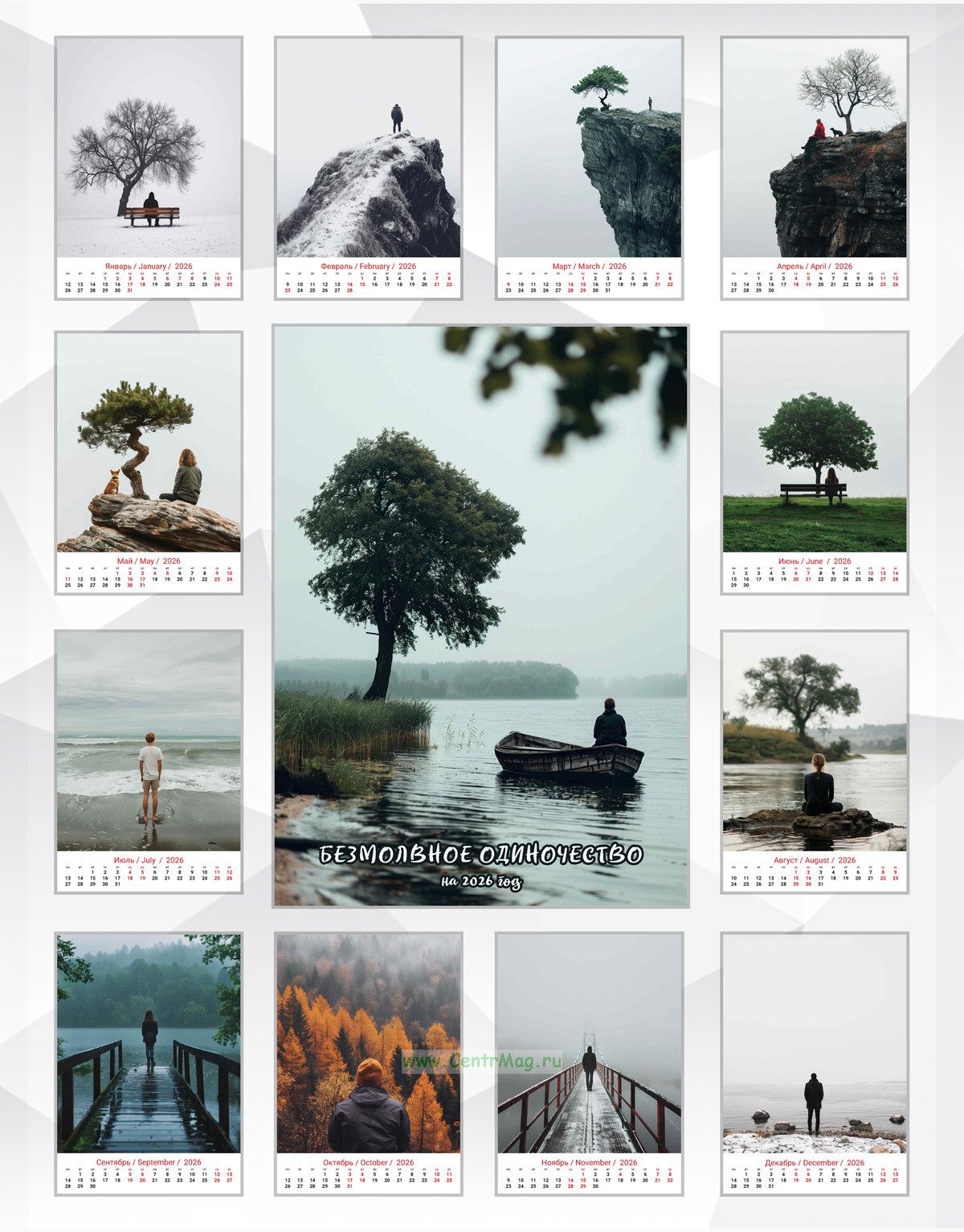 Календарь содержит изображения уединение человека и пророде, эстетику одиночества, сгенерированные с помощью нейросети. Календарь будет отличным подарком для ваших родных, друзей, знакомых, коллег или даже для себя.