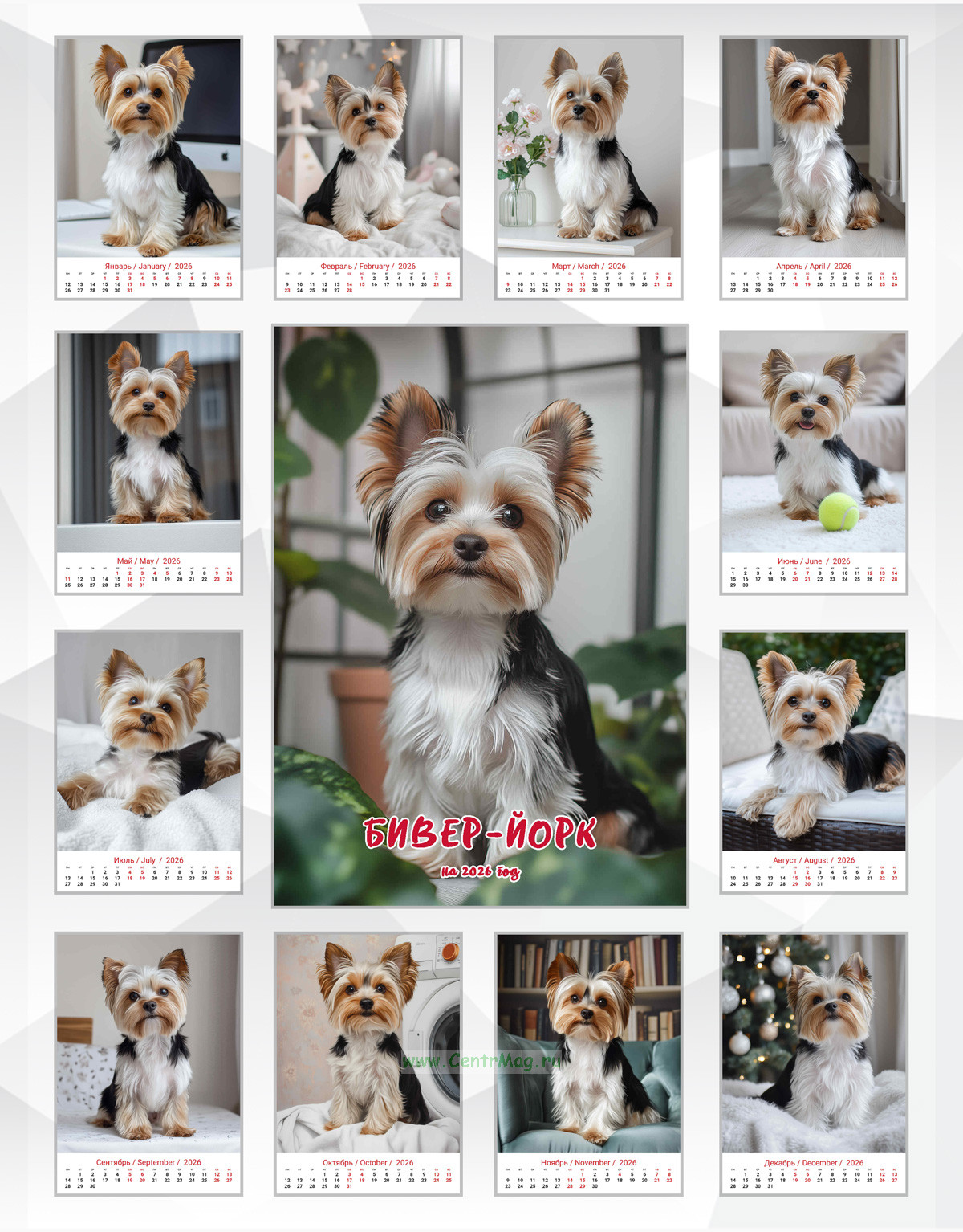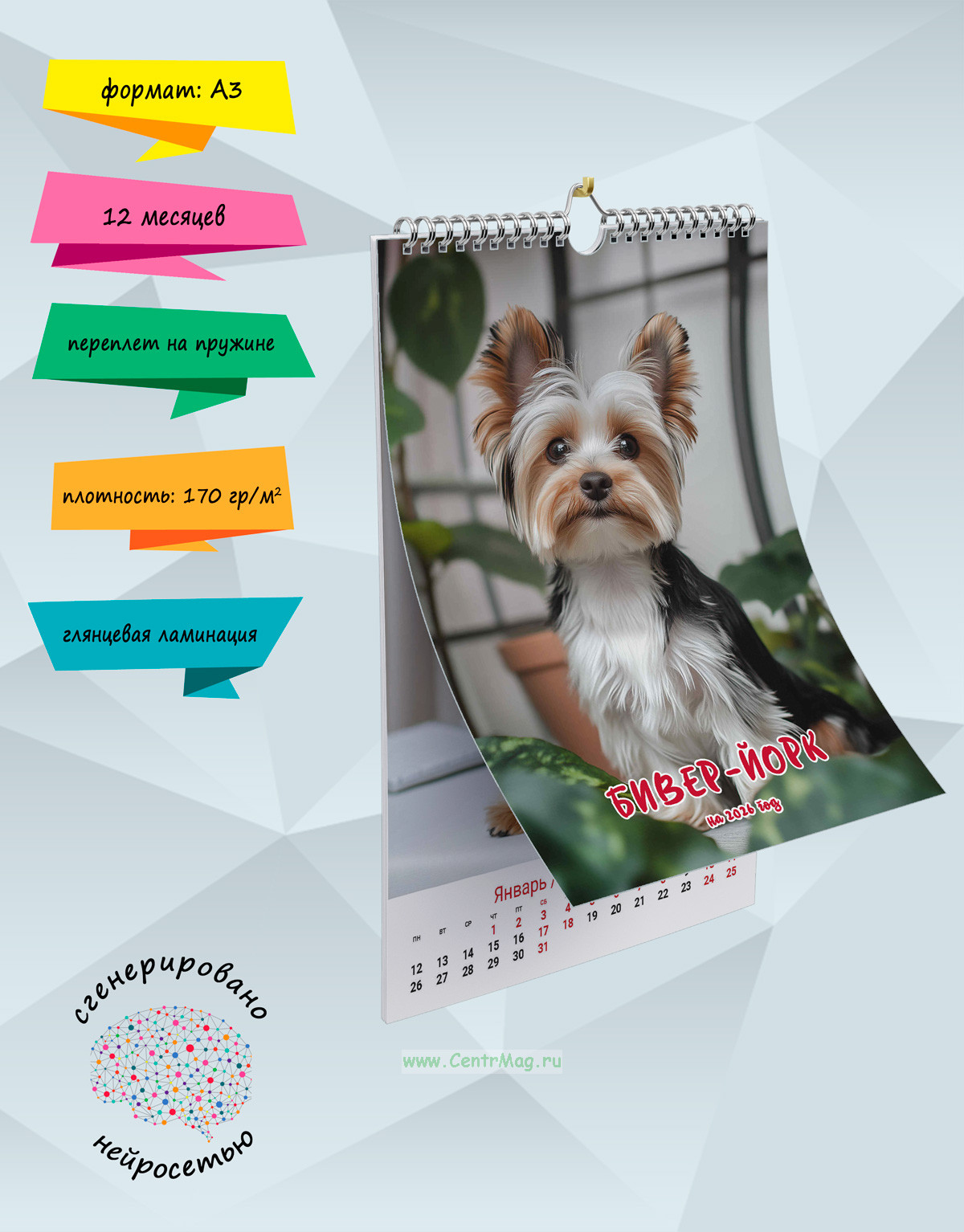 Календарь содержит изображения хорошенького и миленького Бивер-Йорка, сгенерированные с помощью нейросети. Календарь будет отличным подарком для ваших родных, друзей, знакомых, коллег или даже для себя.