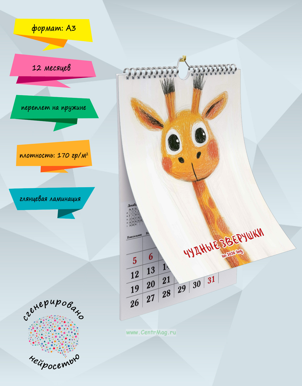 Календарь содержит изображения смешных и милых зверушек, сгенерированные с помощью нейросети. Календарь будет отличным подарком для ваших родных, друзей, знакомых, коллег или даже для себя.